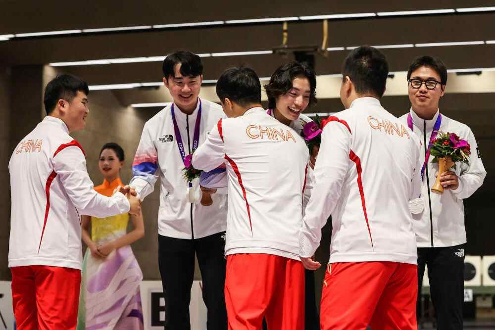 9月25日,冠军中国队选手李越宏(左三)、刘杨攀(左一)、王鑫杰(右二)在男子25米手枪速射团体颁奖仪式上向亚军韩国队致意。