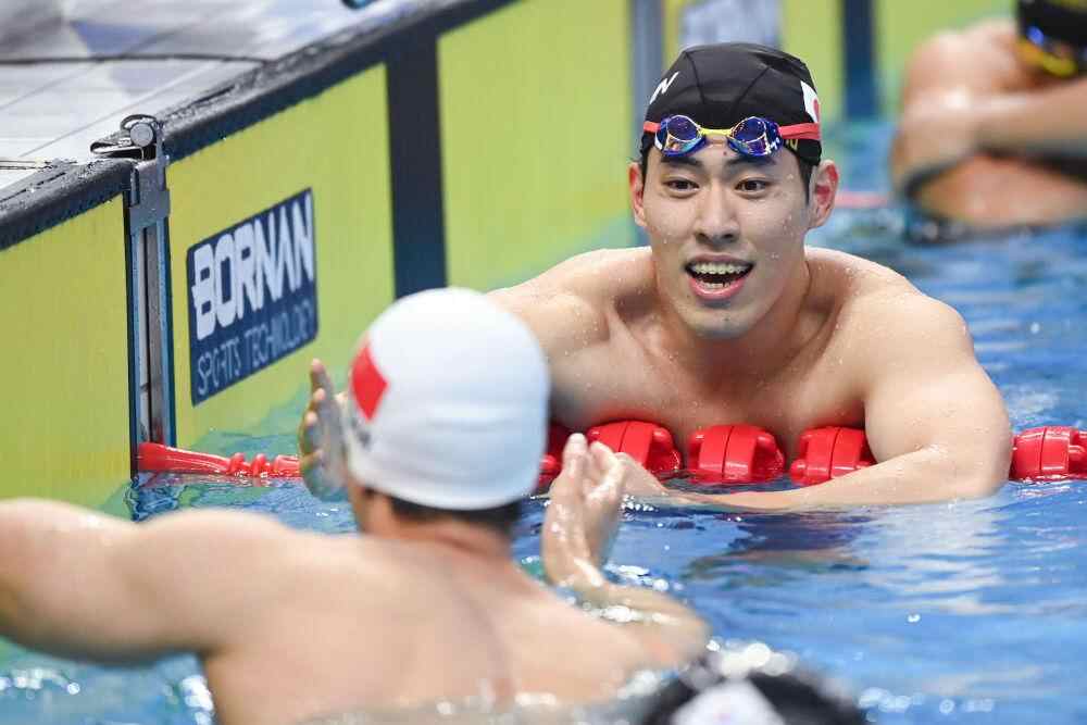 9月28日,中国队选手在男子4X100米自由泳接力决赛后与韩国队和日本队选手致意。