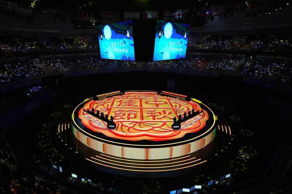 9月28日,中国台北选手李智凱(中)和中国队选手在体操鞍马决赛中互致问候。