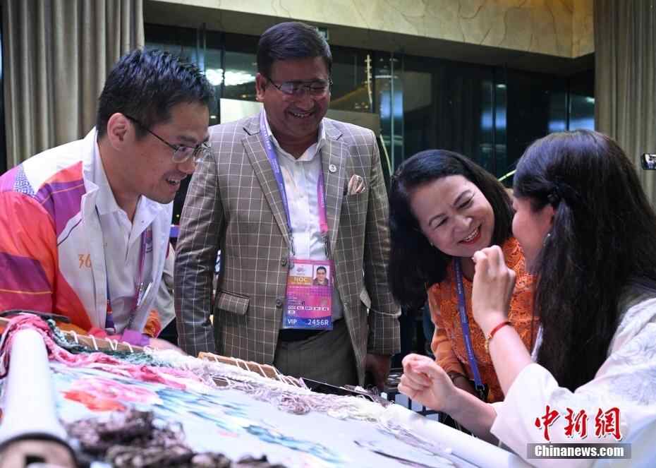 9月29日,中国传统节日中秋节,浙江杭州举行2023西湖中秋赏月雅集活动,向亚奥理事会嘉宾等亚洲友人展示传统中华文化。图为尼泊尔奥委会主席JEEVAN RAM SHRESTHA(左二)观看了解杭绣技艺。