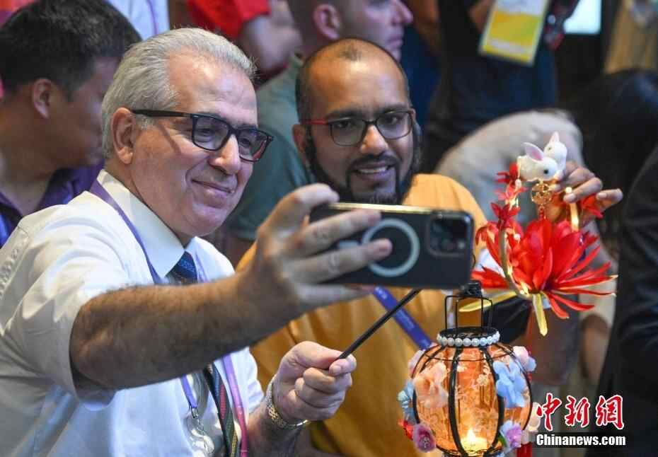 9月29日,中国传统节日中秋节,浙江杭州举行2023西湖中秋赏月雅集活动,向亚奥理事会嘉宾等亚洲友人展示传统中华文化。图为亚奥理事会贵宾和工作人员提着花灯自拍合影。