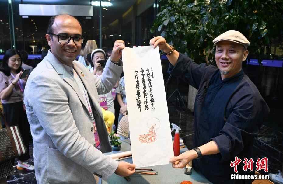 9月29日,中国传统节日中秋节,浙江杭州举行2023西湖中秋赏月雅集活动,向亚奥理事会嘉宾等亚洲友人展示传统中华文化。图为亚洲-大洋洲克柔术联合会工作人员(左)收到非遗工作者赠送的木版水印作品。