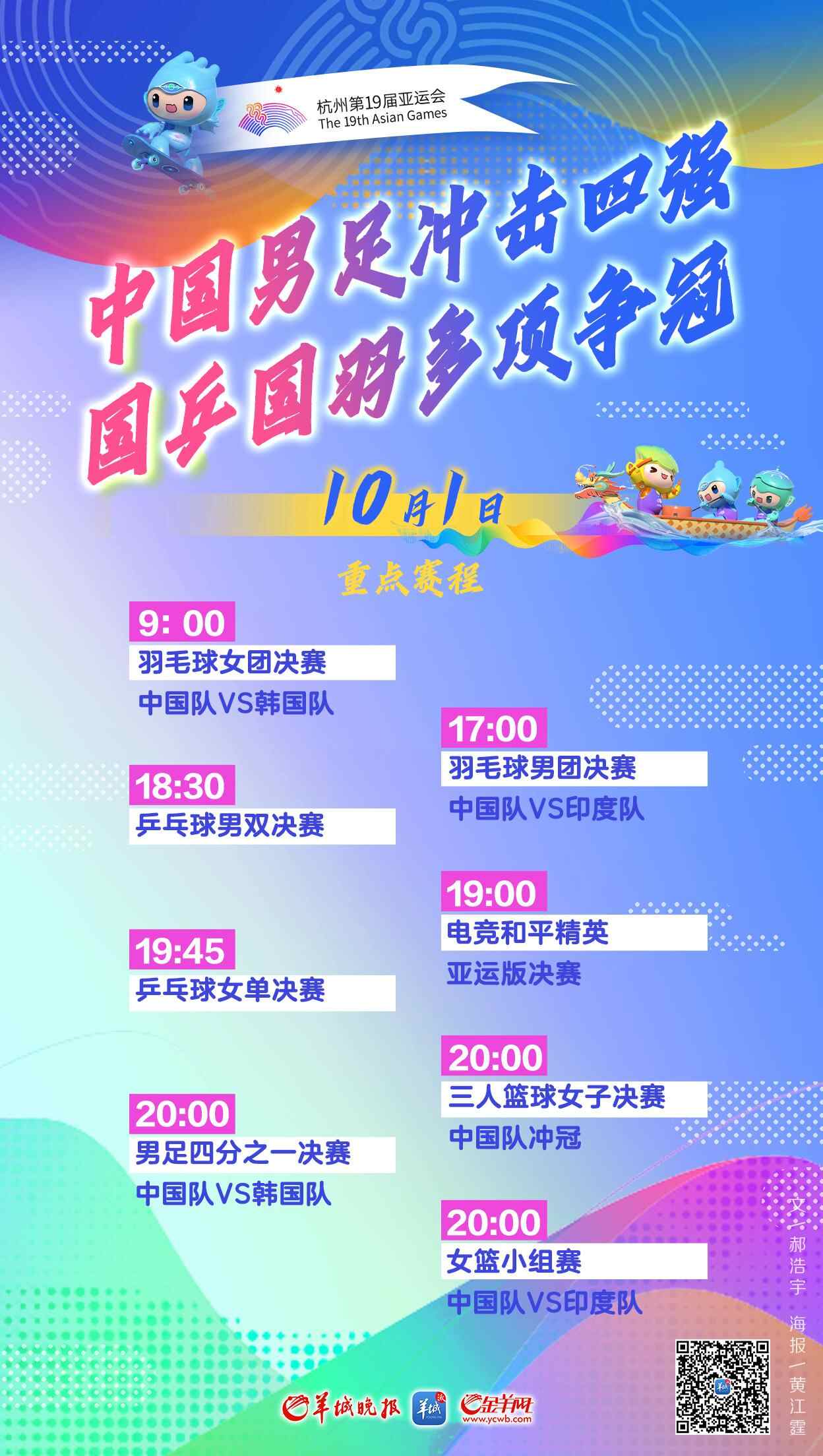 三大球项目中,当天晚上在黄龙体育中心体育场举行男足1/4决赛,中国亚运男足将坐镇主场迎战韩国队。在德清体育中心体育馆中国女排将首次亮相杭州亚运会赛场,迎战小组赛首个对手印度队,取得开门红并无悬念。中国女篮当天的对手同样是印度队,作为小组赛的第三场比赛,期待女篮姑娘以3战全胜的战绩小组出线。