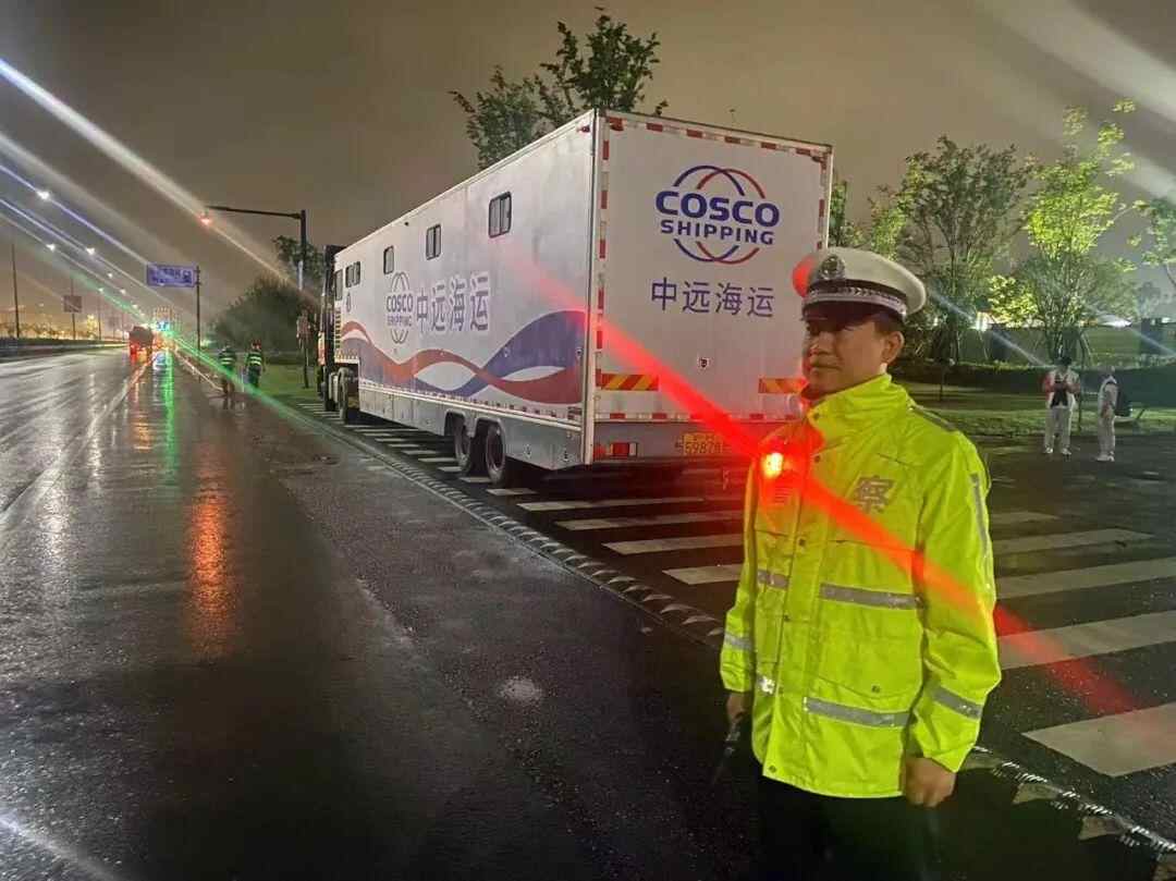 到富春江收费站后,接力棒传到了桐庐县公安局手上。从富春江收费站到桐庐马术中心,有29公里的公路,由桐庐县公安局交警大队和富春江派出所、横村派出所、桐君派出所、瑶琳派出所等联动,加上沿线各镇、街道的义警队伍,保障运输车畅行。