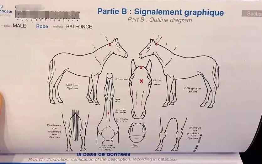 护照第二页,往往是对马的相貌的记录。马术运动起源于欧洲,沿袭传统登记方法,会有马的手绘像,比如马脑门上有缕白色闪电型状的毛,马的四条腿是白色的等特征,以及马身上的烙印,都会用手绘示意出来。
