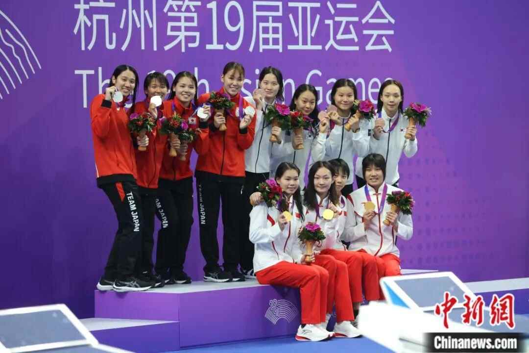 2023年9月28日,杭州第19届亚运会女子4x200米自由泳接力颁奖仪式在杭州奥体中心游泳馆举行。中国队(下)以7分49秒34获得金牌,日本队(左)以7分55秒93获得银牌,韩国队(右)以8分00秒11获得铜牌。汤彦俊 摄