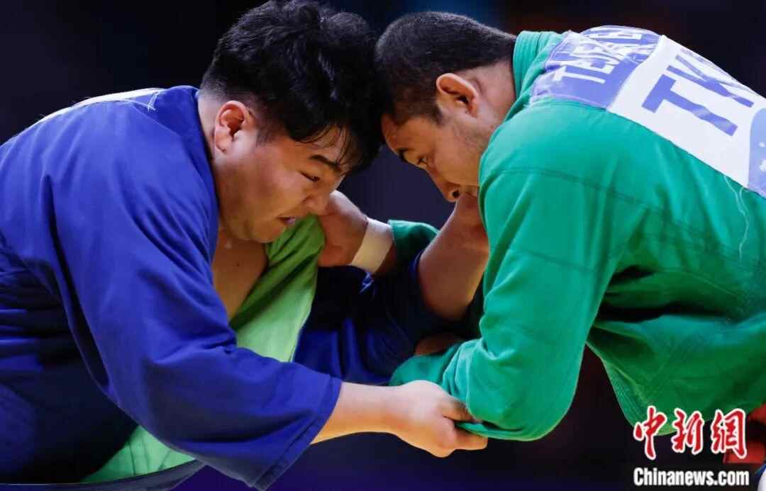 2023年9月30日,杭州第19届亚运会克柔术男子 90公斤级半决赛在杭州萧山临浦体育馆举行。土库曼斯坦选手捷延-捷耶诺夫(绿)与韩国选手鄭準溶交手。杜洋 摄