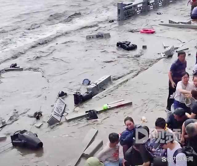 画面显示,浪潮冲塌护栏后,多名游客被冲倒。有游客表示:“这个好危险,连石头都冲断了。”