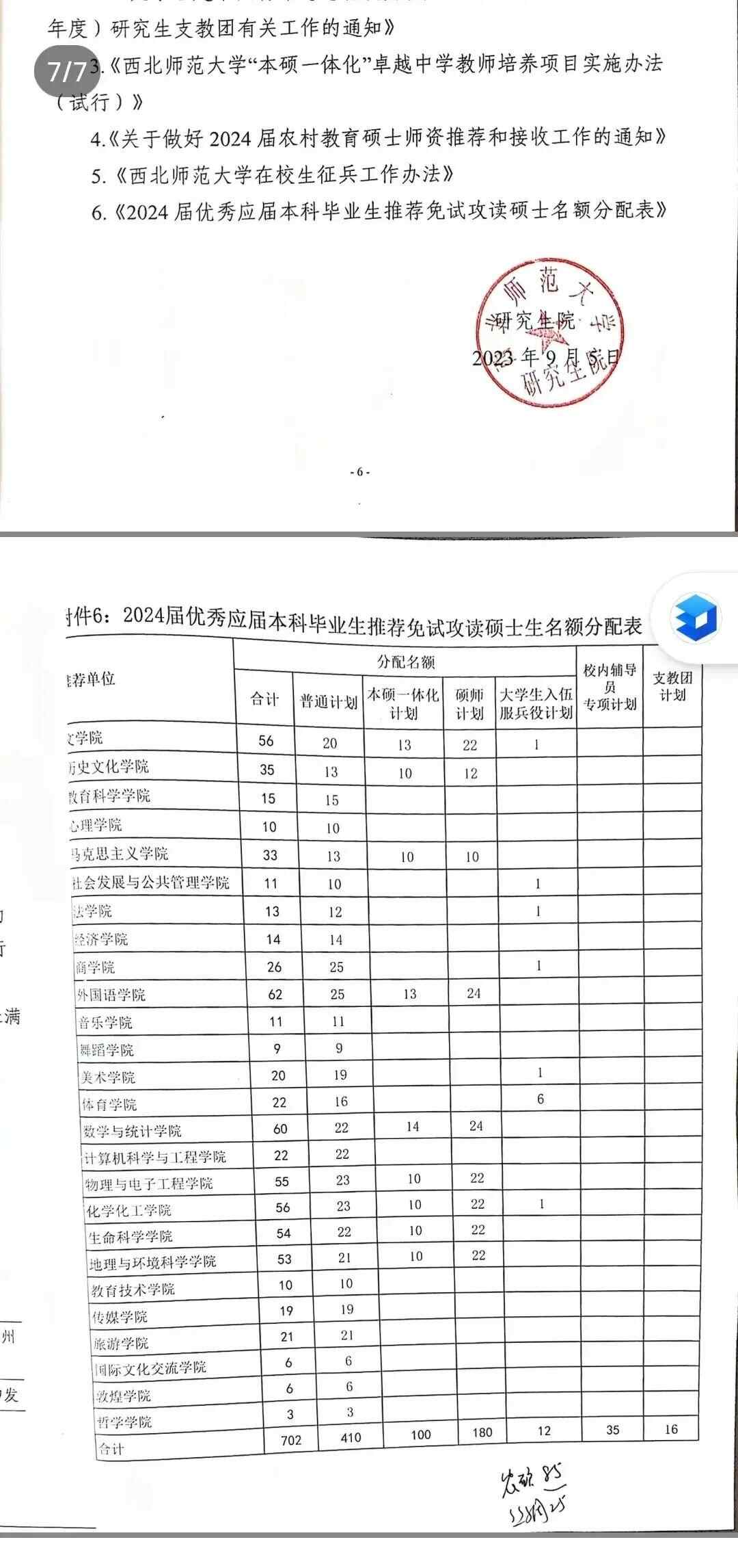 网传西北师范大学2024届推免硕士生名额分配表。图片来源:网络