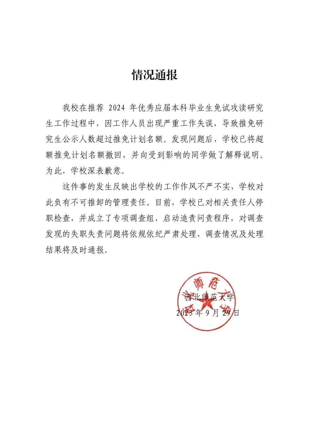 西北师范大学在通报中称,该校在推荐2024年优秀应届本科毕业生免试攻读研究生工作过程中,因工作人员出现严重工作失误,导致推免研究生公示人数超过推免计划名额。发现问题后,学校已将超额推免计划名额撤回,并向受到影响的同学做了解释说明。
