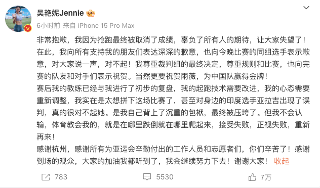 在文中,吴艳妮说“非常抱歉,我因为抢跑最终被取消了成绩,辜负了所有人的期待,让大家失望了!在此,我向所有支持我的朋友们表达深深的歉意,也向今晚比赛的同组选手表示歉意,对大家说一声,对不起!我尊重裁判组的最终决定,尊重规则和比赛,也向完赛的队友和对手们表示祝贺。当然更要祝贺雨薇,为中国队赢得金牌!”
