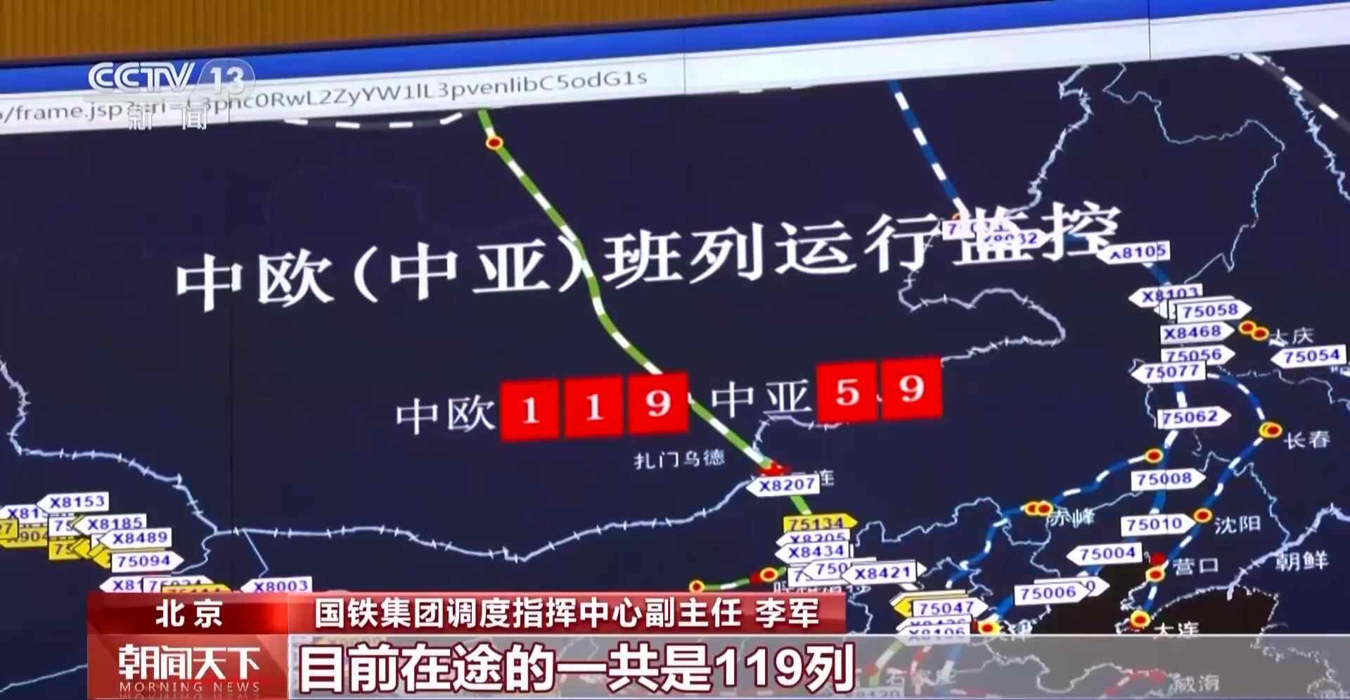 国铁集团调度指挥中心副主任 李军:现在是14:45左右,我们现在显示中欧班列目前在途的一共是119列,其中去程是64列,回程是55列,现在日开行各个站始发的一共是40列中欧班列。