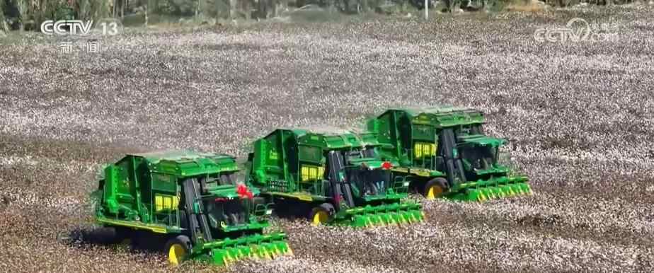 2023年,当地棉花种植面积74万亩。在玛纳斯县凉州户镇吕家庄村的万亩棉田里,3台新引进的棉花采收打包一体机正在采收棉花。采棉机能够高效快速地将棉花从棉秆上脱离,采净率高达95%以上。一台采棉机平均每天可采收700多亩棉花,相当于1000名拾花工劳动量的总和。