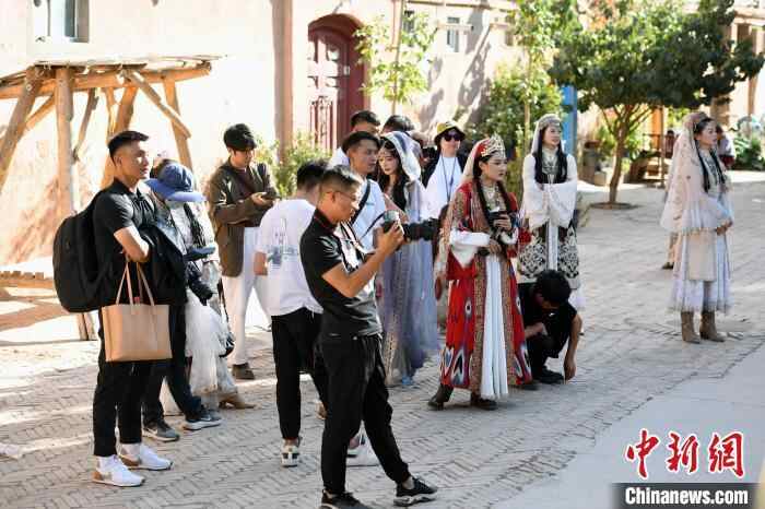 图为在喀什古城景区里一处网红打卡点旅拍摄影师正在拍摄。中新网记者 孙亭文 摄