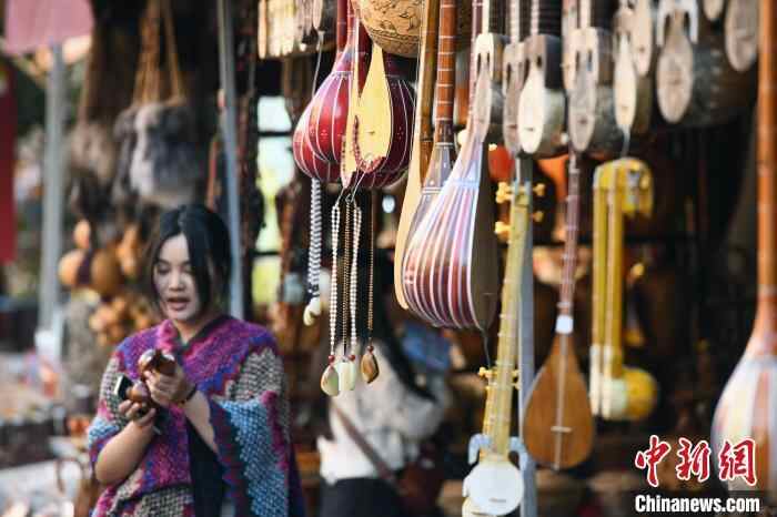 图为在喀什古城景区里一名游客正在挑选乐器。中新网记者 孙亭文 摄