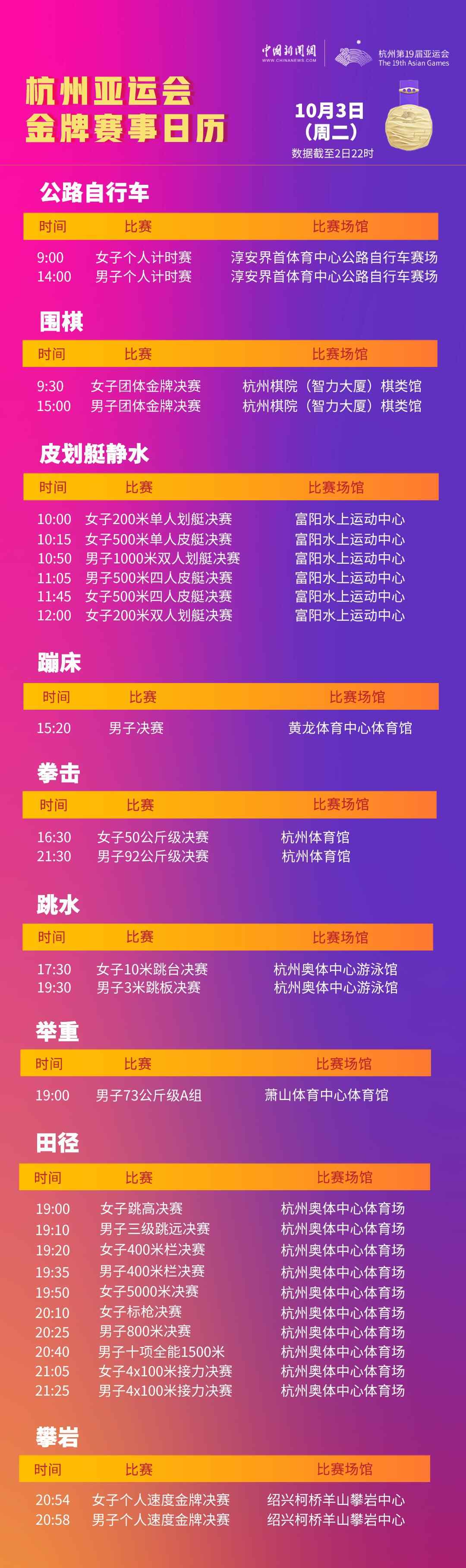 中新网10月3日电 3日,杭州亚运会将在皮划艇、田径、举重、拳击等项目上产生28枚金牌。
