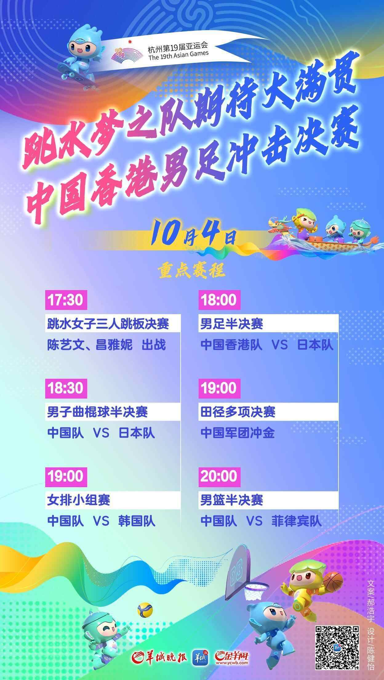 10月4日晚上,男篮将展开半决赛的争夺,中国男篮将与菲律宾队争夺决赛入场券;同时中国女排将与韩国女排展开较量。