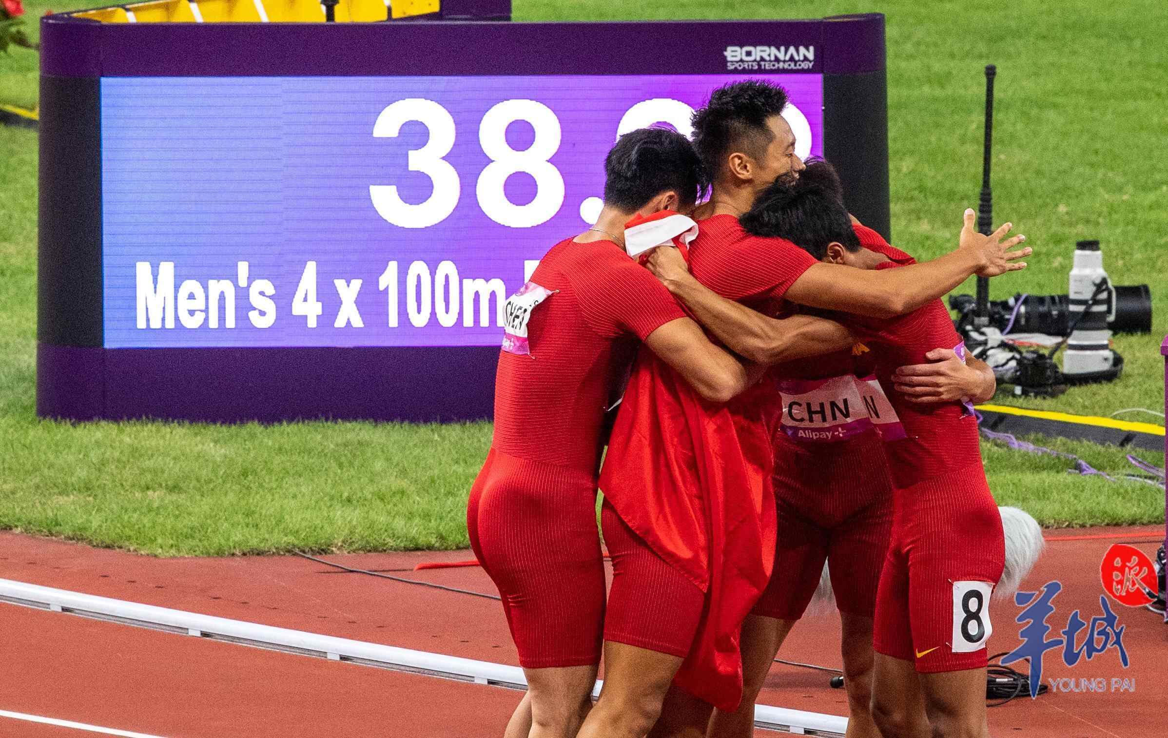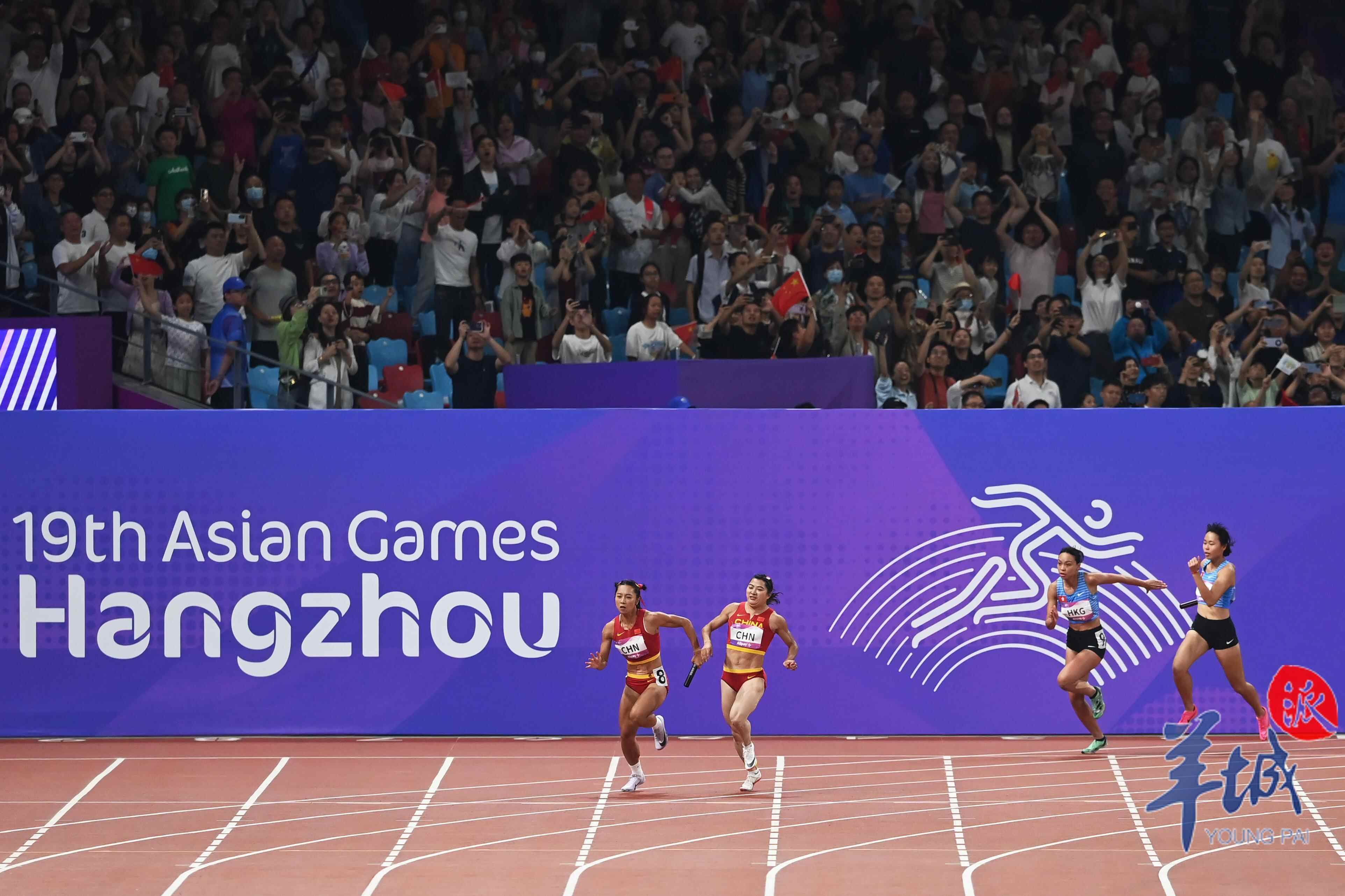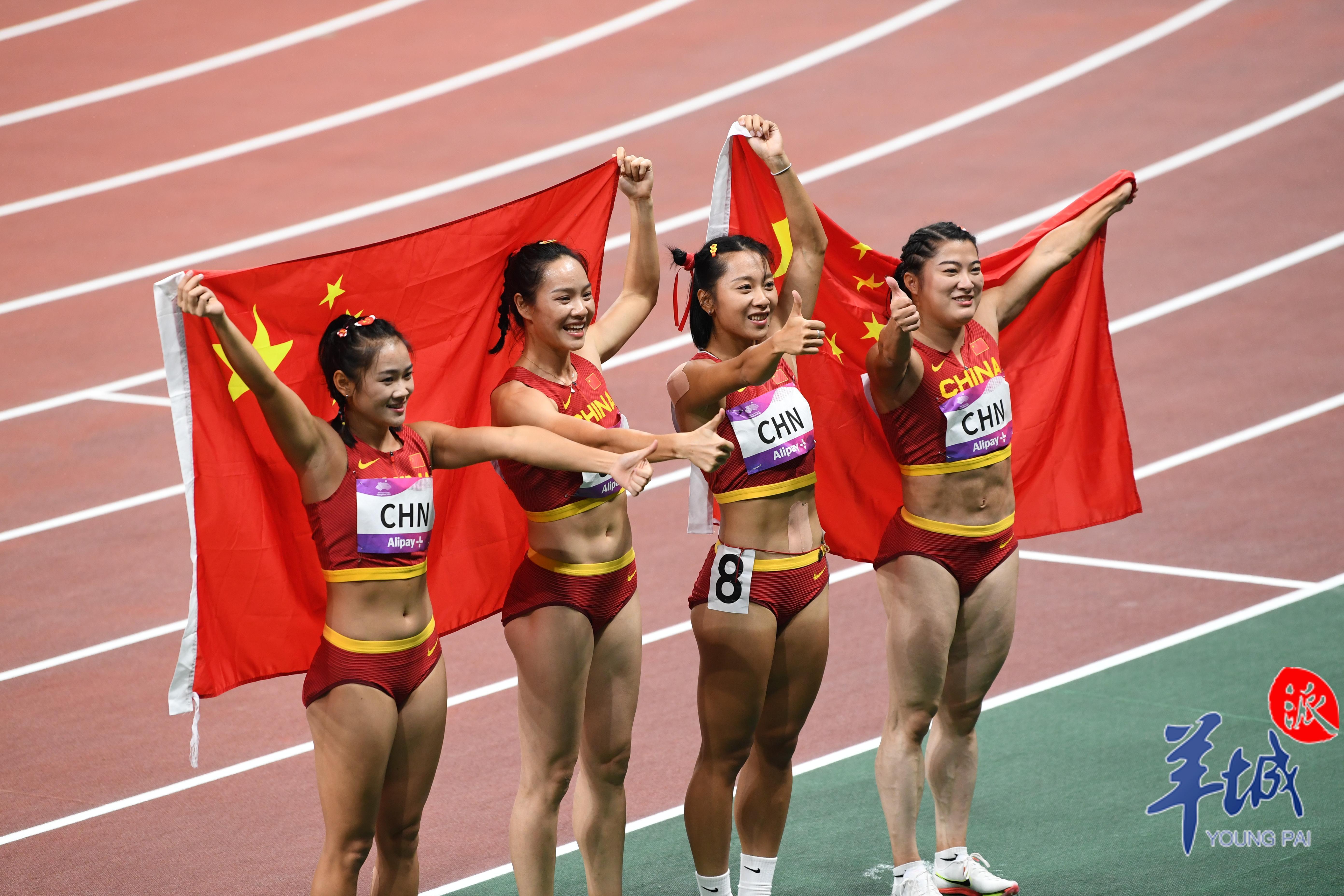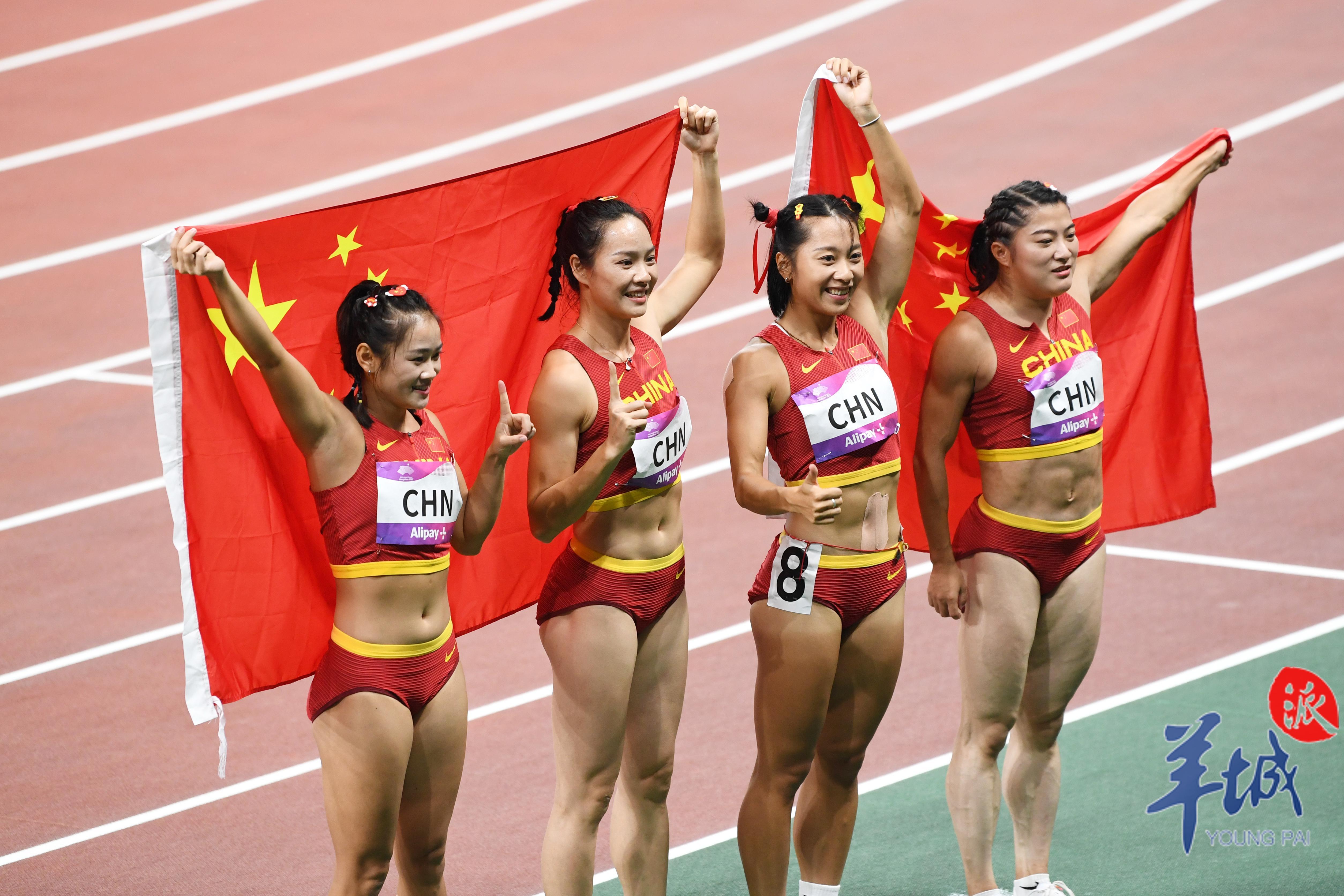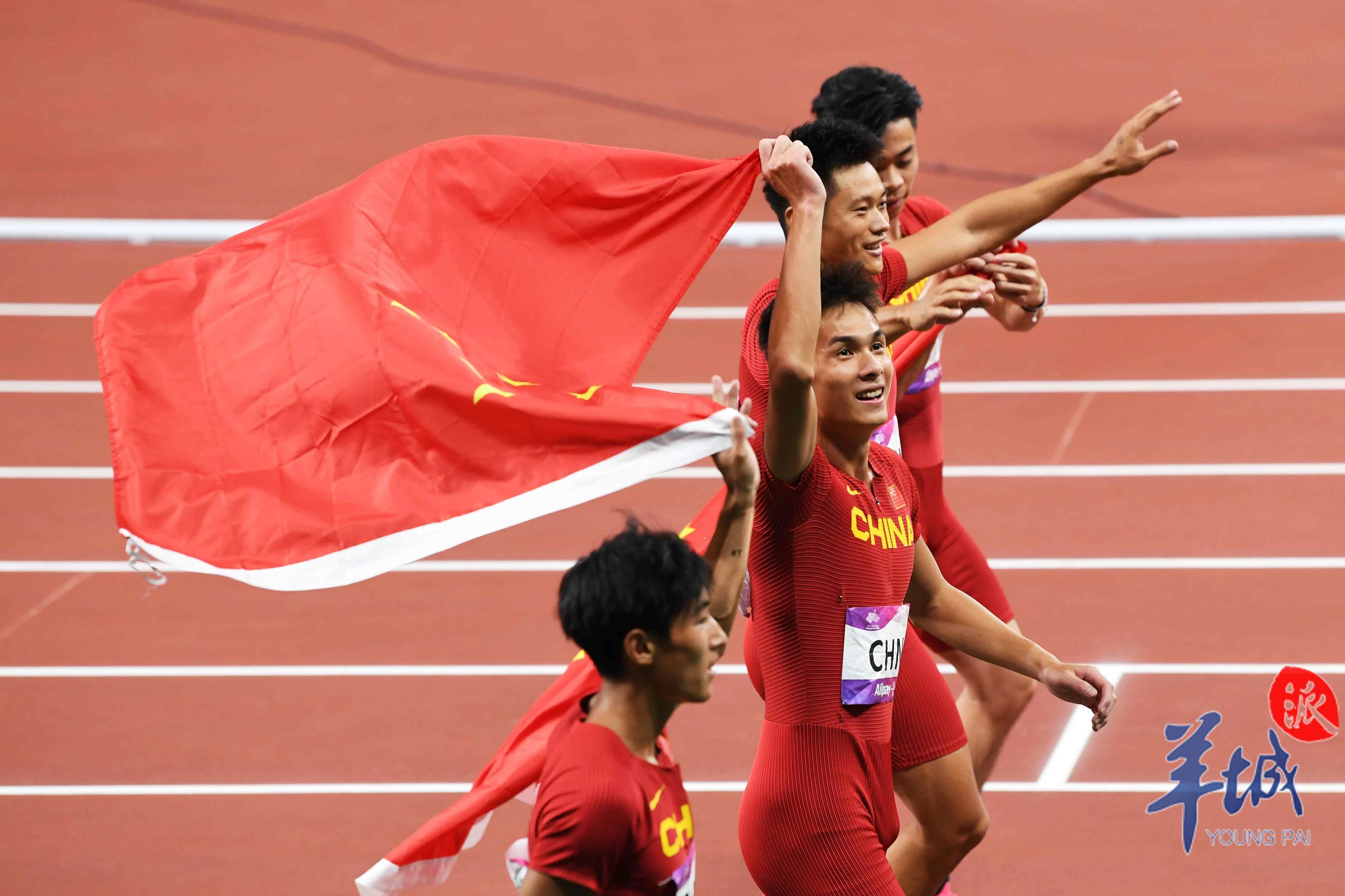 10月3日,杭州奥体中心的田径场上演热血沸腾的一幕,当晚压轴大战男女4×100米接力赛,中国军团演绎中国速度,由广东选手陈冠锋、严海滨和谢震业、陈佳鹏组成的中国男子接力队以38秒29的赛季最佳成绩夺冠,由广东选手梁小静、韦永丽、袁琦琦和葛曼棋组成的中国女子接力队以43秒39的成绩摘得金牌。