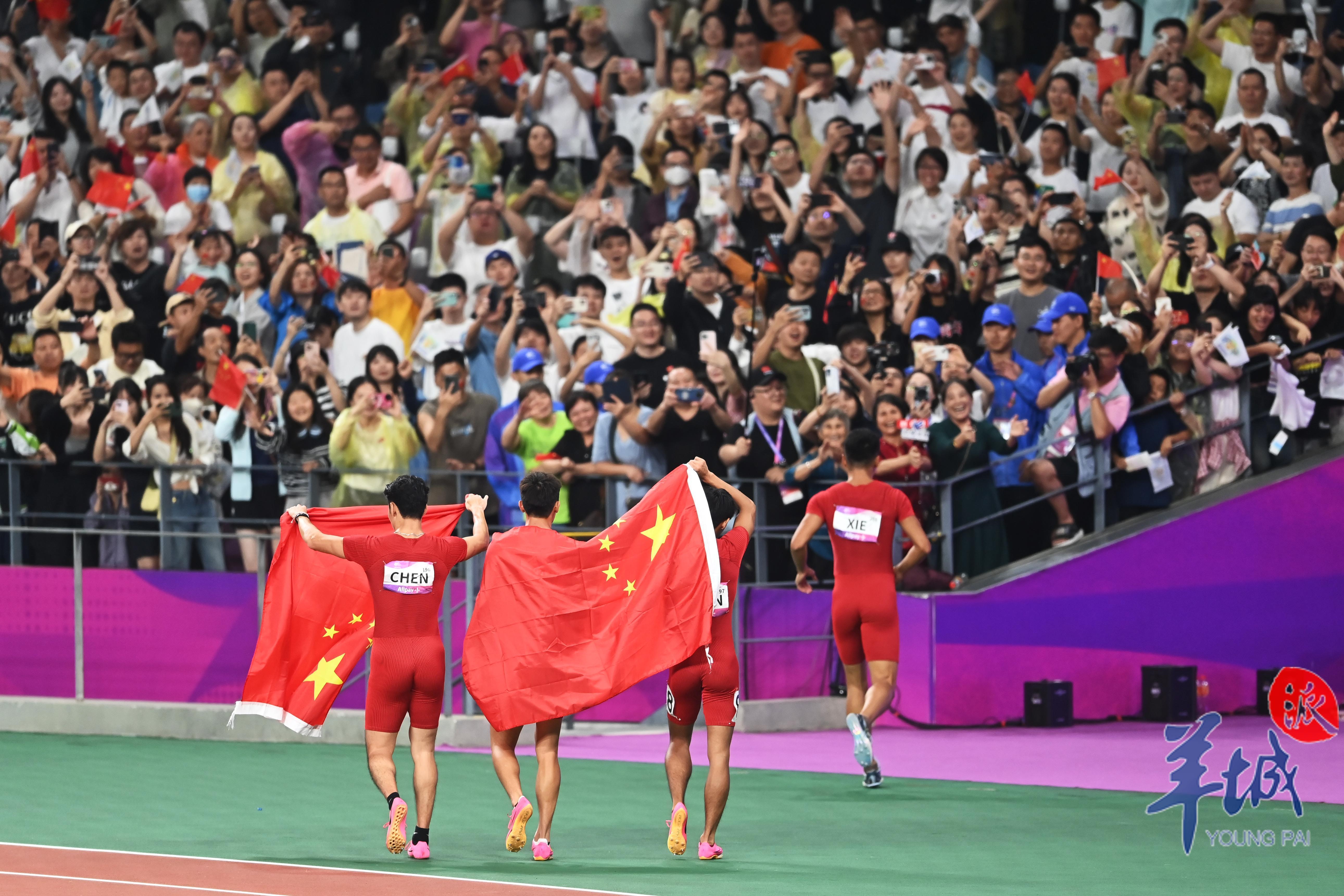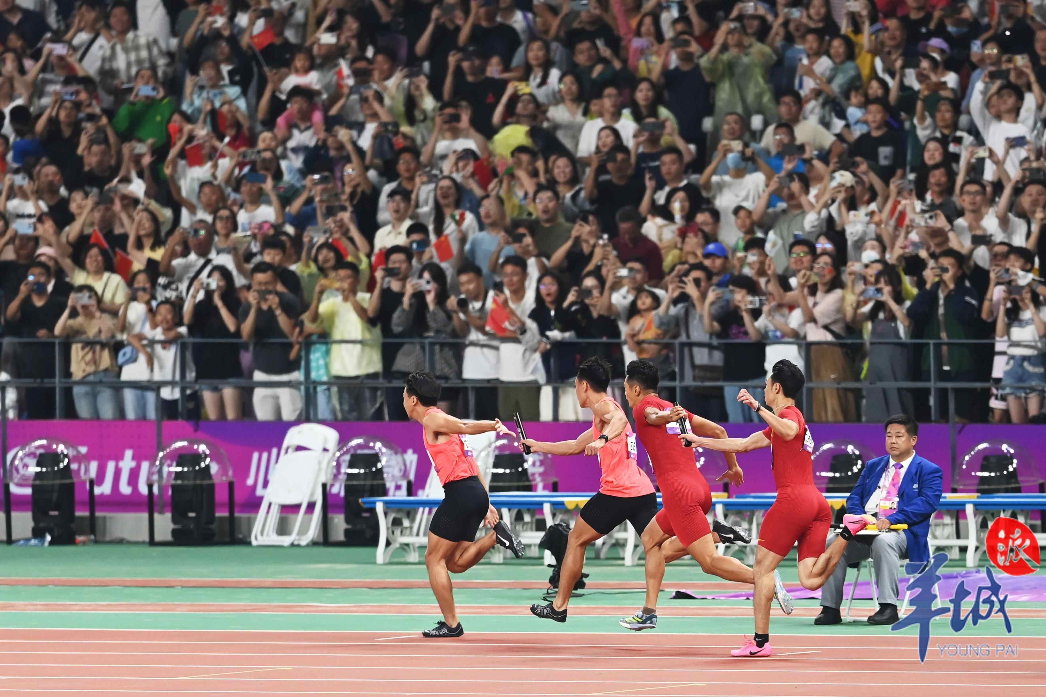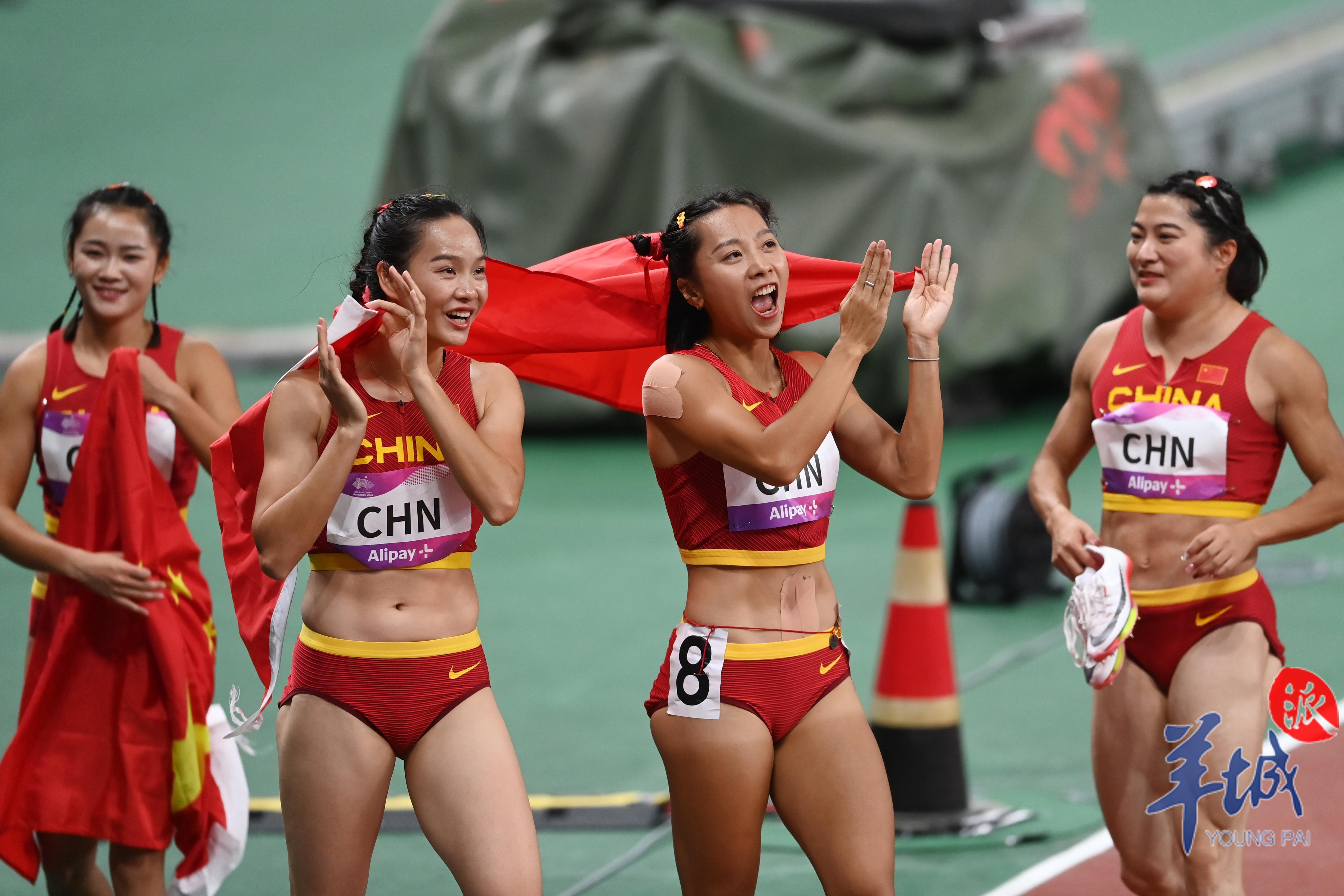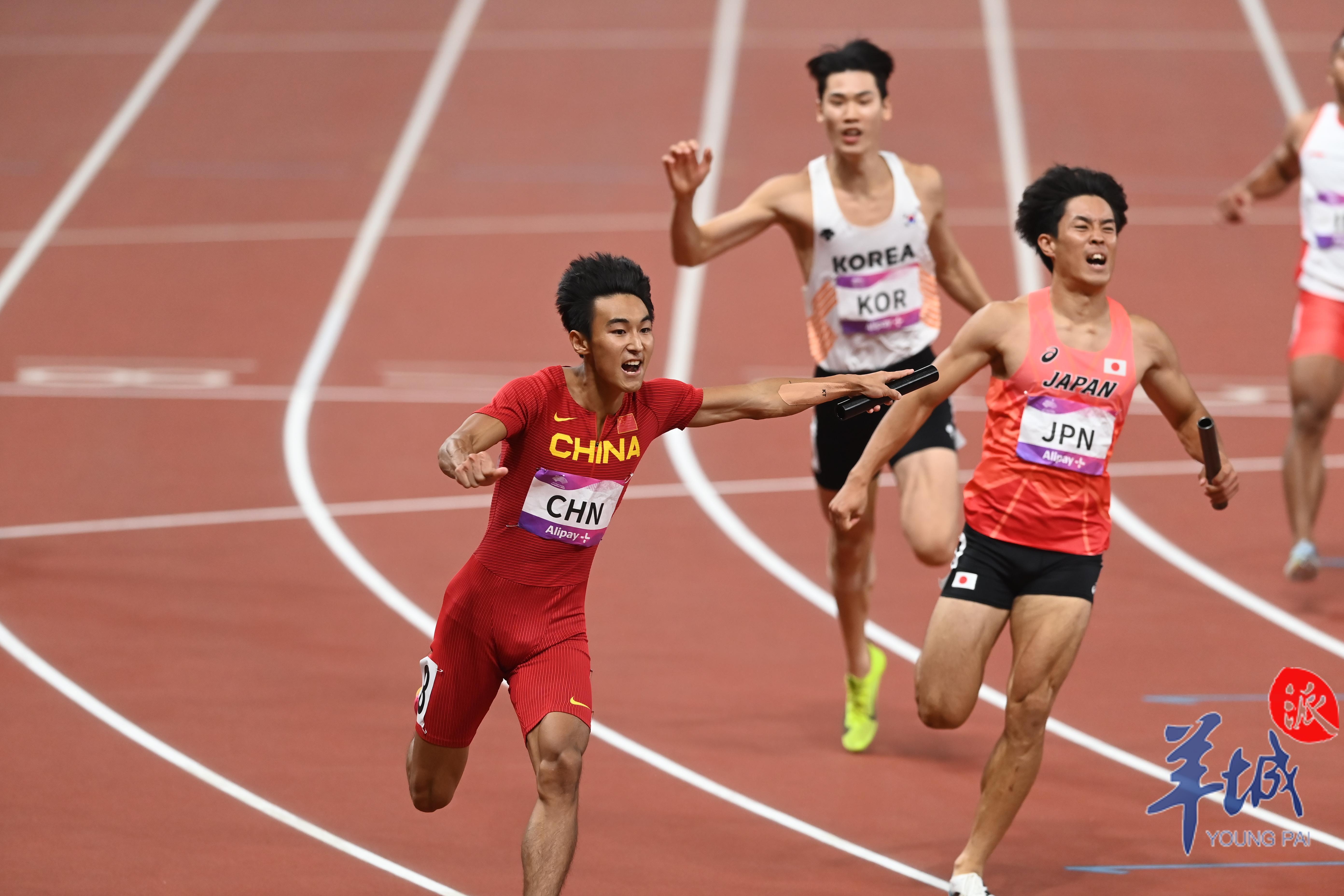 10月3日,杭州奥体中心的田径场上演热血沸腾的一幕,当晚压轴大战男女4×100米接力赛,中国军团演绎中国速度,由广东选手陈冠锋、严海滨和谢震业、陈佳鹏组成的中国男子接力队以38秒29的赛季最佳成绩夺冠,由广东选手梁小静、韦永丽、袁琦琦和葛曼棋组成的中国女子接力队以43秒39的成绩摘得金牌。
