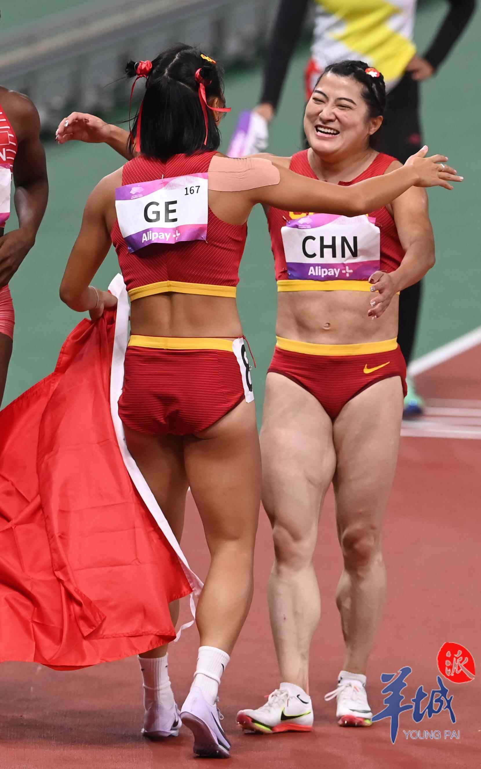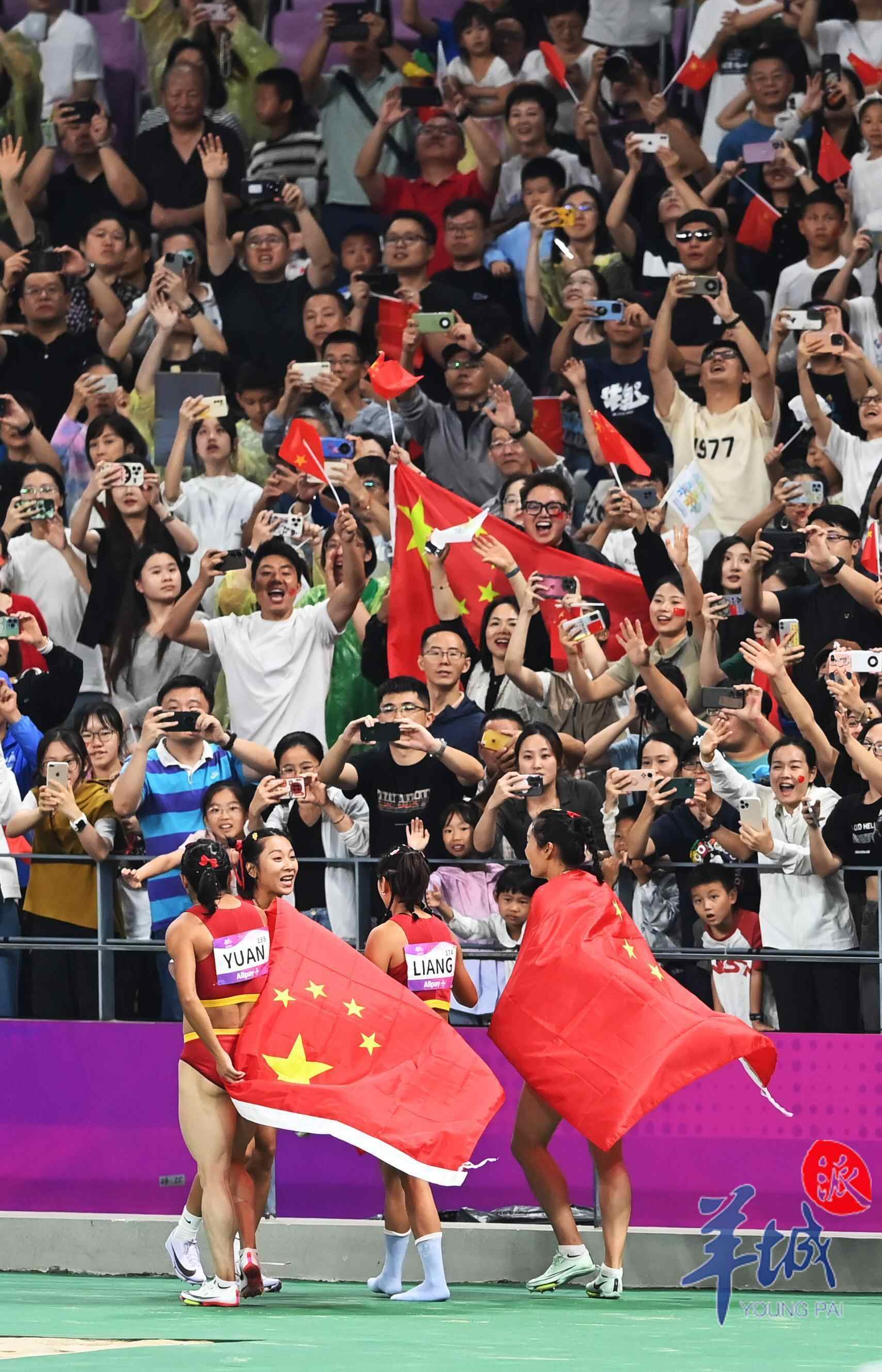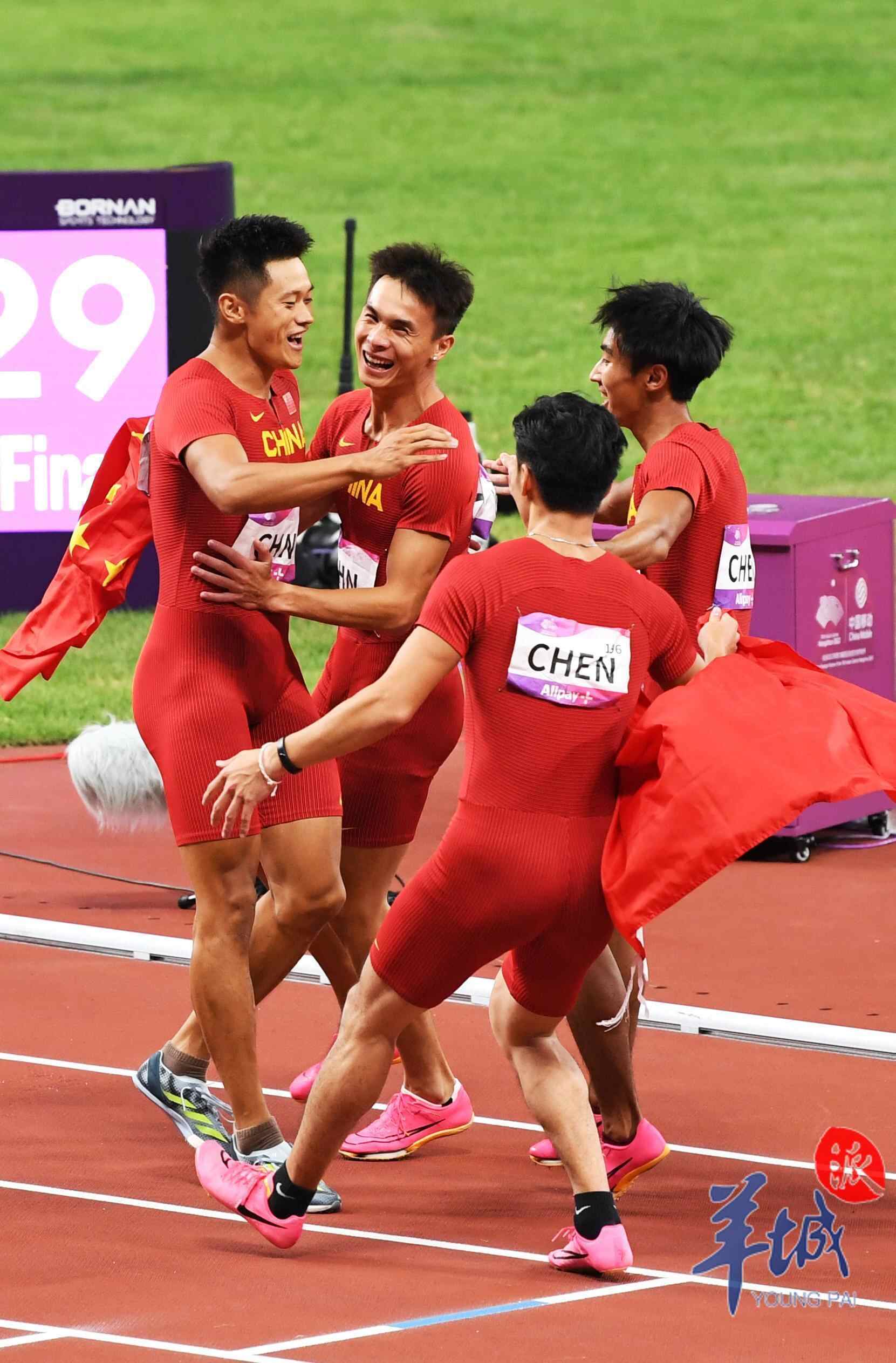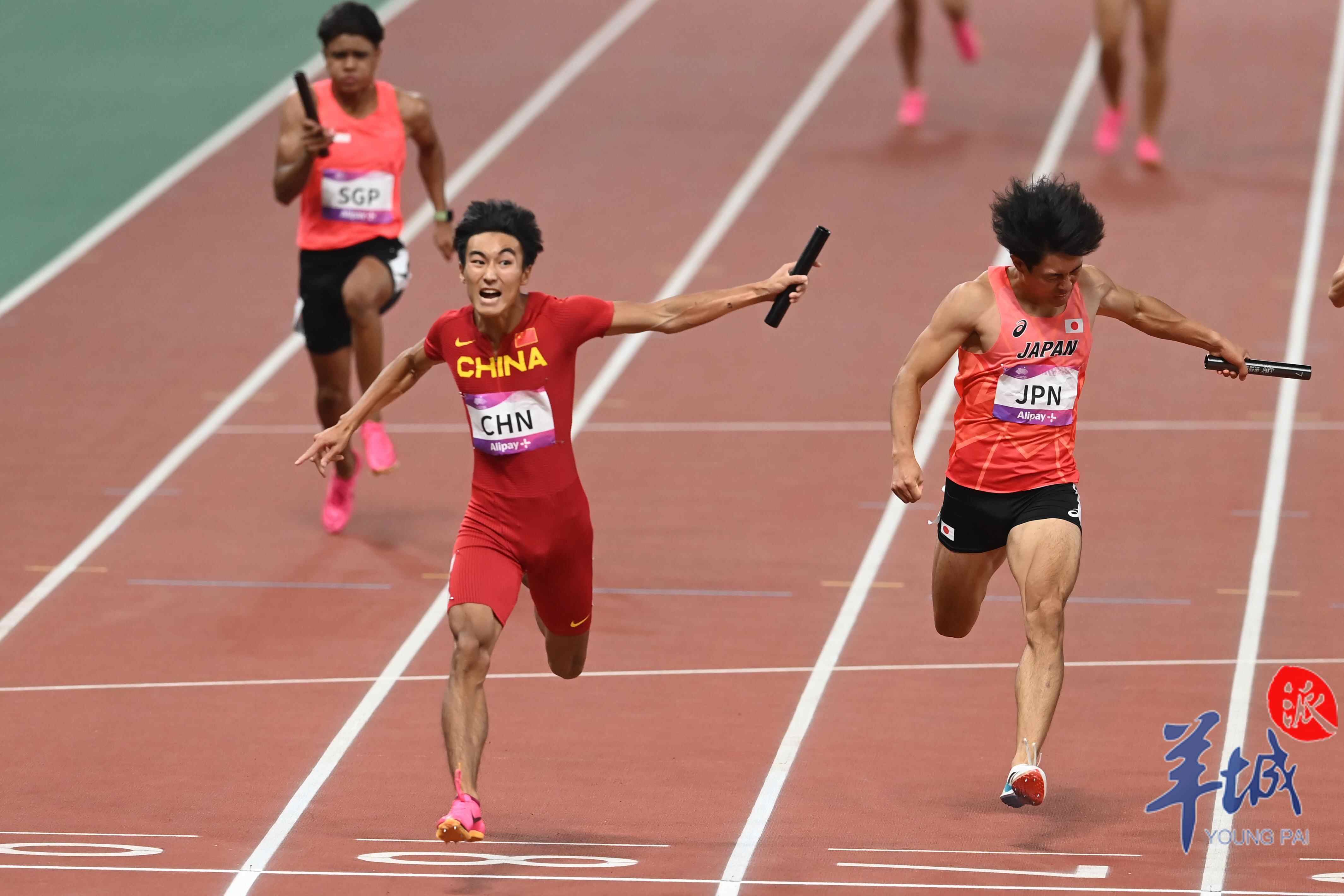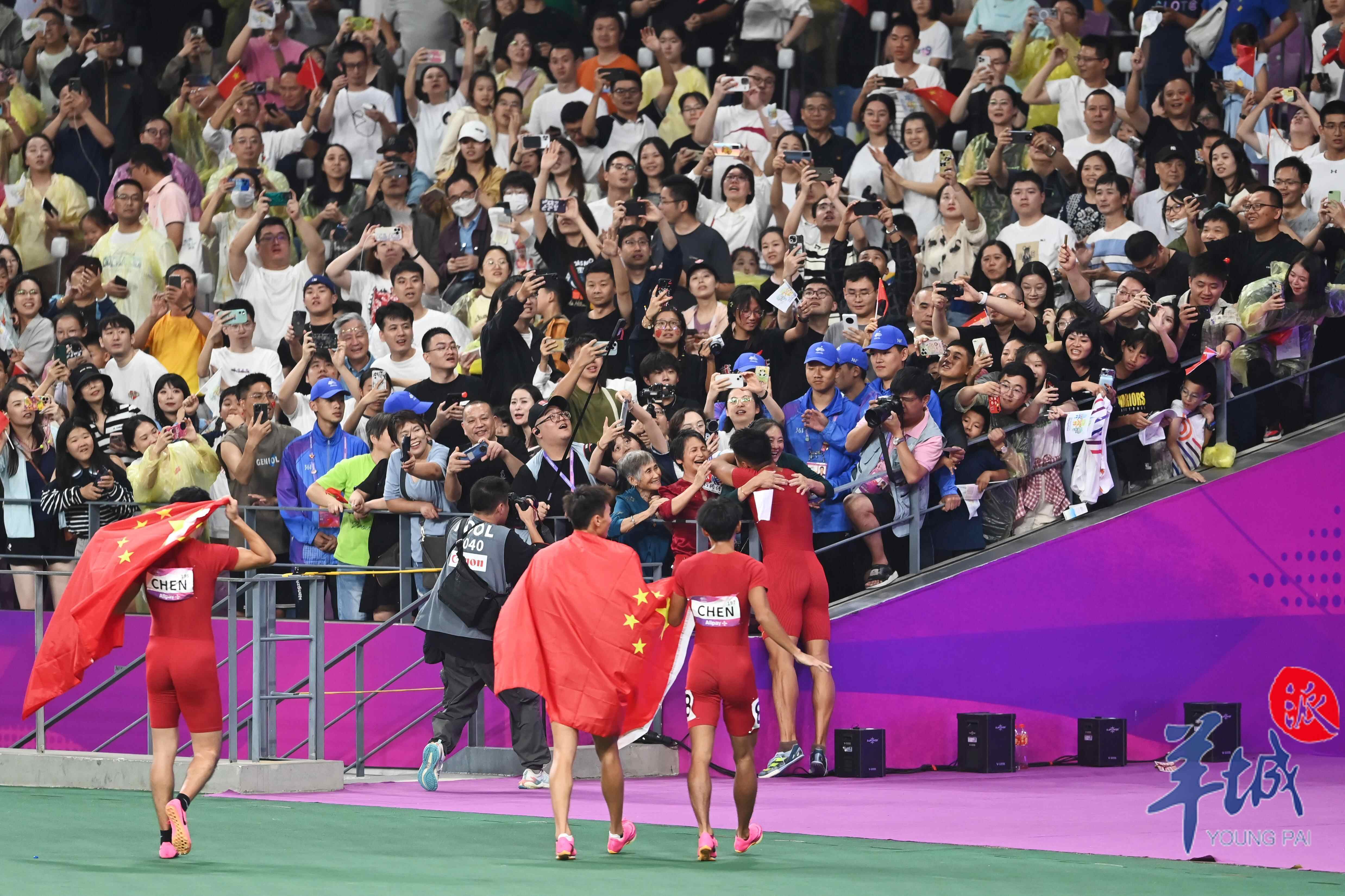 10月3日,杭州奥体中心的田径场上演热血沸腾的一幕,当晚压轴大战男女4×100米接力赛,中国军团演绎中国速度,由广东选手陈冠锋、严海滨和谢震业、陈佳鹏组成的中国男子接力队以38秒29的赛季最佳成绩夺冠,由广东选手梁小静、韦永丽、袁琦琦和葛曼棋组成的中国女子接力队以43秒39的成绩摘得金牌。