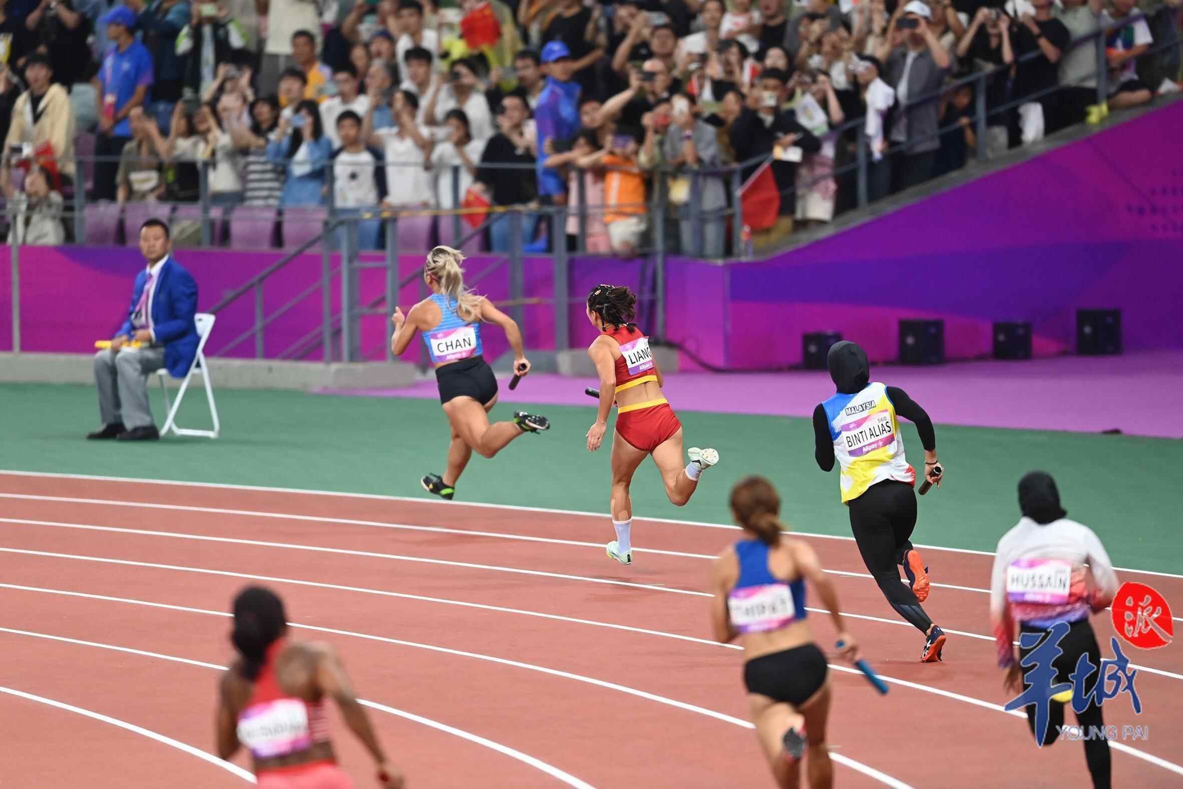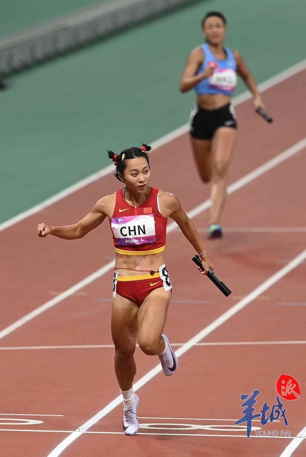 女子4×100米接力赛决赛上,同样被分在第8道的中国队棒次依次为梁小静、韦永丽、袁琦琦和葛曼棋,广东“小马达”梁小静在起跑后就一马当先,确定领先优势,接力棒经韦永丽、袁琦琦顺畅交接后,本届亚运会女子百米金牌得主葛曼棋全力加速,最终以头名撞线。