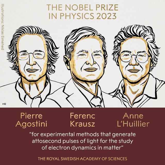北京时间10月3日17时50分许,在瑞典首都斯德哥尔摩,瑞典皇家科学院宣布,将2023年诺贝尔物理学奖授予美国俄亥俄州立大学名誉教授皮埃尔·阿戈斯蒂尼(Pierre Agostini)、德国马克斯·普朗克量子光学研究所教授费伦茨·克劳斯(Ferenc Krausz)和瑞典隆德大学教授安妮·呂利耶(Anne L’Huillier),三人平分奖金,以表彰他们在“产生阿秒光脉冲以研究物质中电子动力学的实验方法”方面所做出的贡献。
