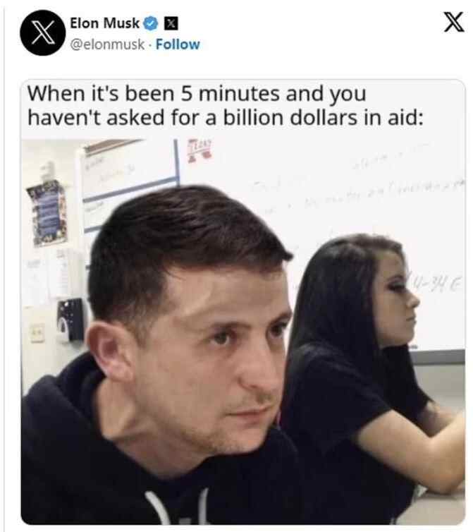 马斯克于社交媒体平台X发布关于泽连斯基的表情包,图片内文写道:“5分钟过去了,你还没有要求10亿美元的援助。”乌克兰总统府顾问波多利亚克则在X平台发文回复:“今天对于乌克兰的任何沉默或讽刺,都是对俄国宣传辩解自身大规模暴力和破坏行径的直接鼓励。”