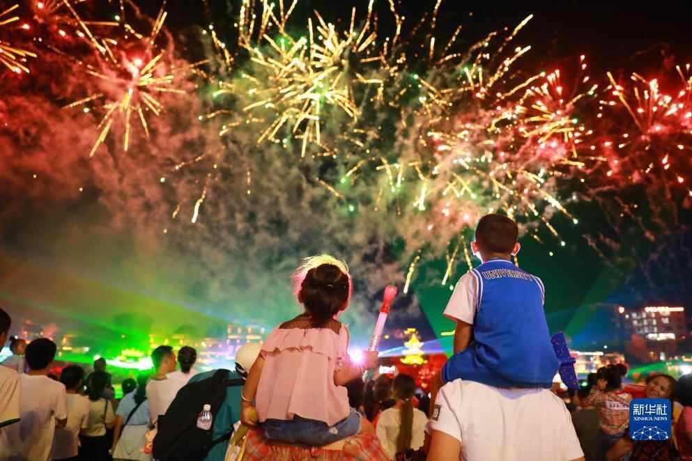 10月1日,游客在贵州省黔东南苗族侗族自治州凯里市下司古镇观赏烟花。