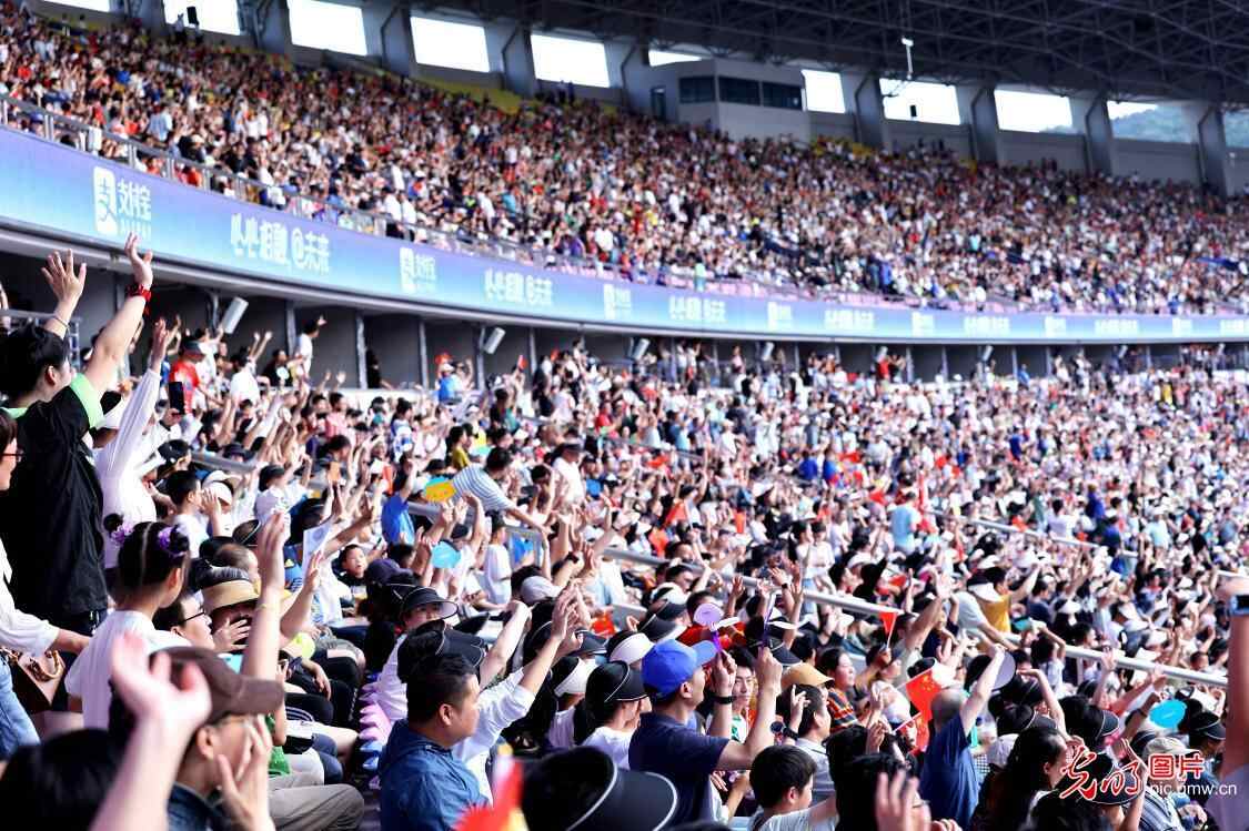 2023年10月2日,在淳安界首体育中心,大批观众为杭州亚运会铁人三项混合接力赛的运动员加油。(杨波摄/光明图片)