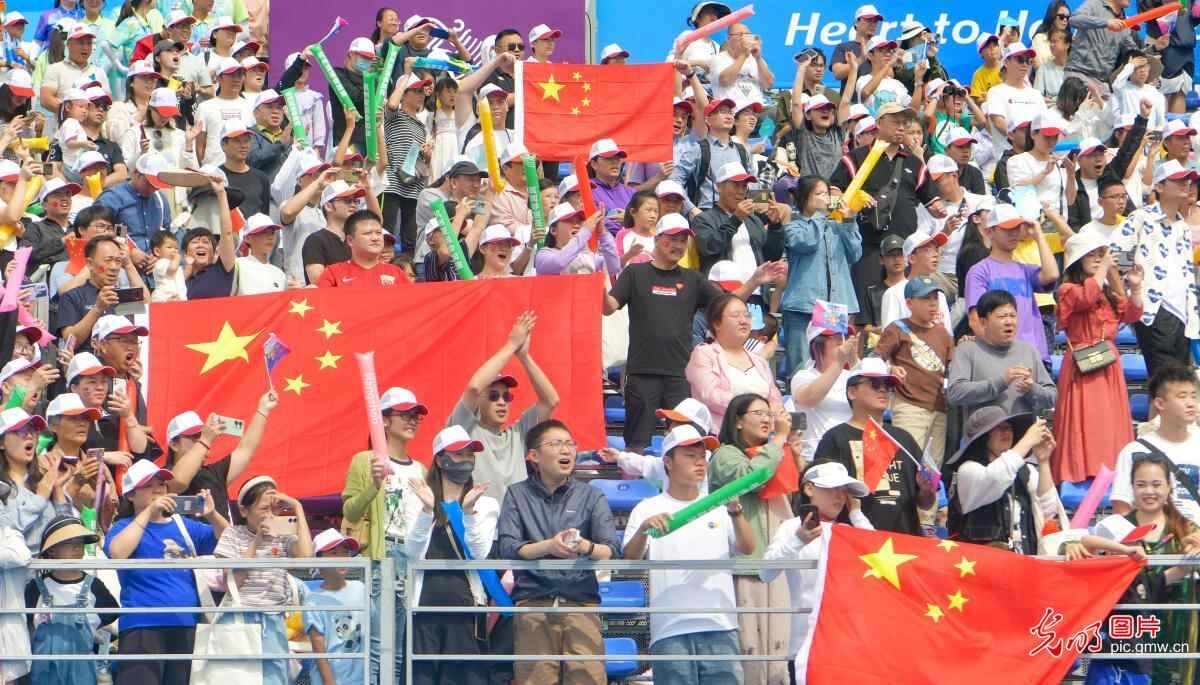 2023年10月1日,在杭州市黄龙体育中心,3万多名到场观众为亚运足球比赛呐喊助威。(周方玲摄/光明图片)