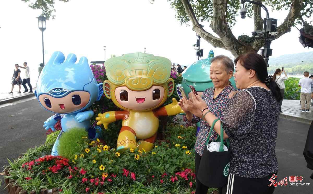 2023年10月1日,游人在杭州西湖断桥桥头与杭州亚运会吉祥物花坛合影。(廖祖平摄/光明图片)