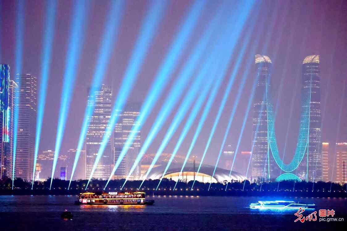 2023年9月28日,杭州市“庆亚运 迎双节”钱江两岸主题灯光秀,绚丽多彩,吸引众多市民游客驻足观看。(周方玲摄/光明图片)