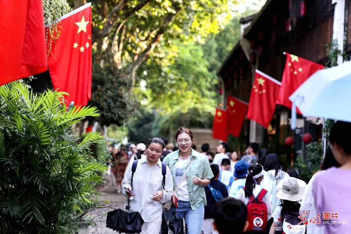 2023年9月29日,游客在杭州市拱墅区大运河畔的桥西历史文化街区游玩。(周方玲摄/光明图片)
