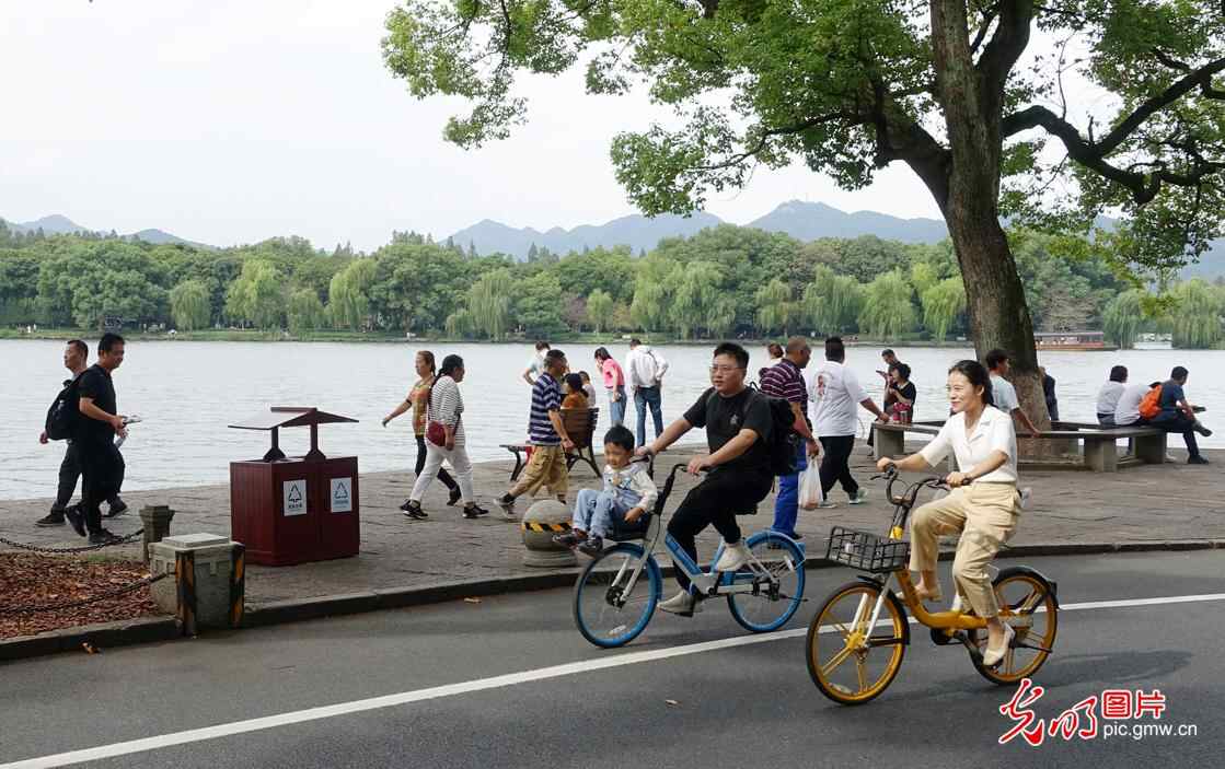 2023年10月1日,游人在杭州西湖湖畔骑行游览。(廖祖平摄/光明图片)