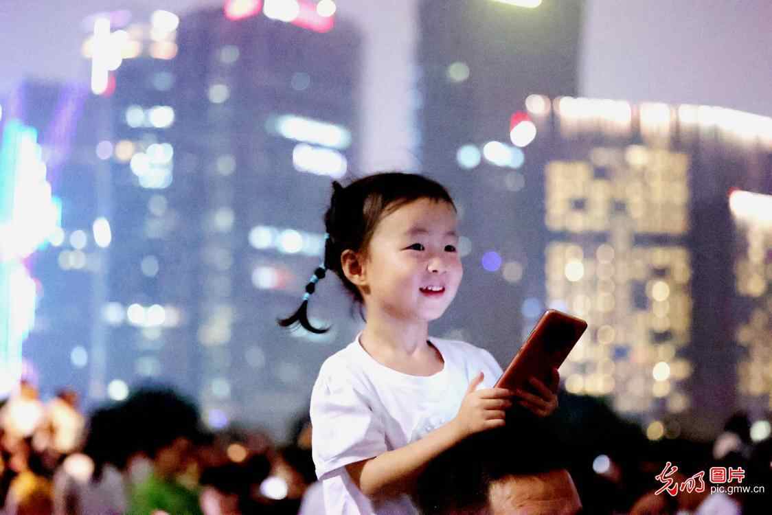 2023年9月28日晚,市民游客在杭州钱江新城城市阳台观看钱江两岸的主题灯光秀。(周方玲摄/光明图片)