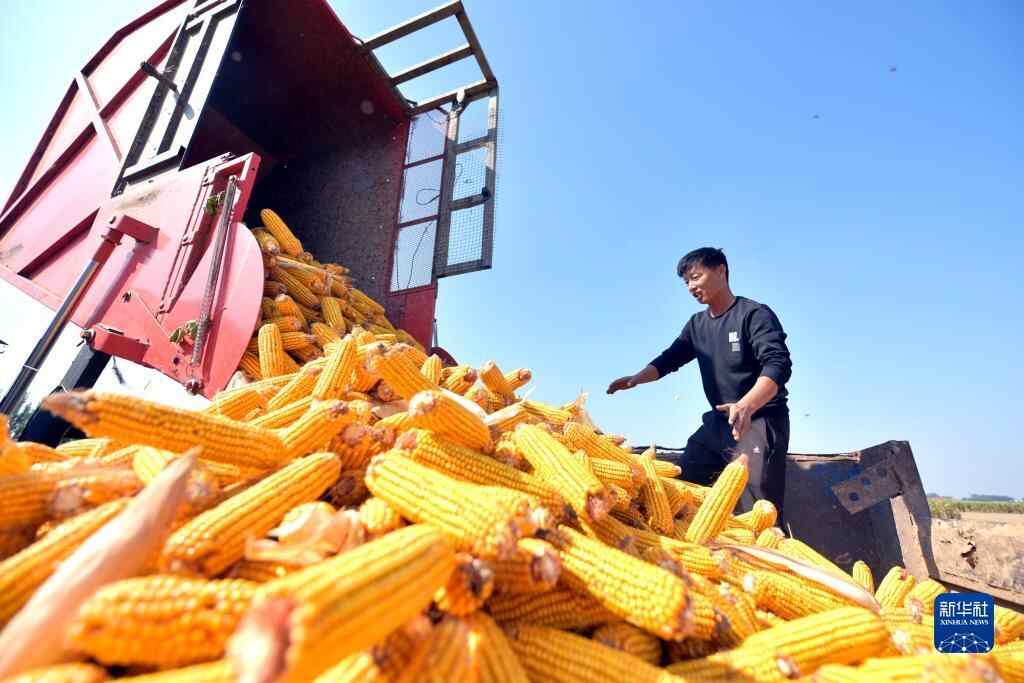 10月3日,在山东省聊城市茌平区贾寨镇侯楼村,村民在田间收获玉米。新华社发(赵玉国 摄)