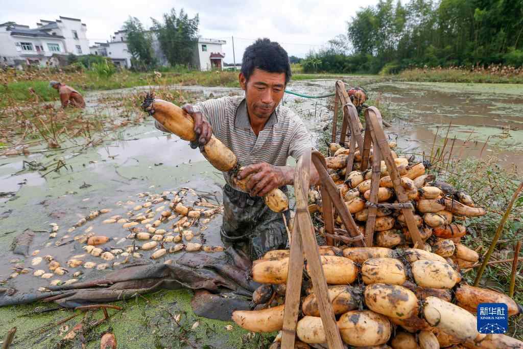 10月4日,村民在安徽省黄山市徽州区潜口镇东山村采摘莲藕。新华社发(施亚磊 摄)