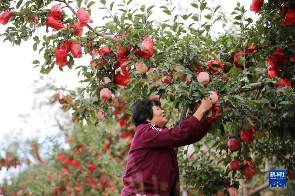 10月2日,在甘肃省静宁县贾河乡侯山村下山社果园,农户在忙着解袋。近日,甘肃省平凉市静宁县100万亩苹果陆续上市。新华社发(侯崇慧 摄)