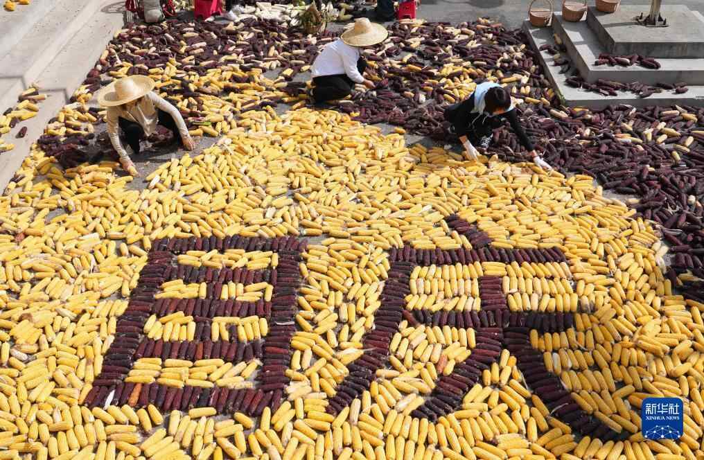 10月4日,在北京市平谷区平谷镇北台头村村委会,村民在晾晒玉米。新华社记者 任超 摄