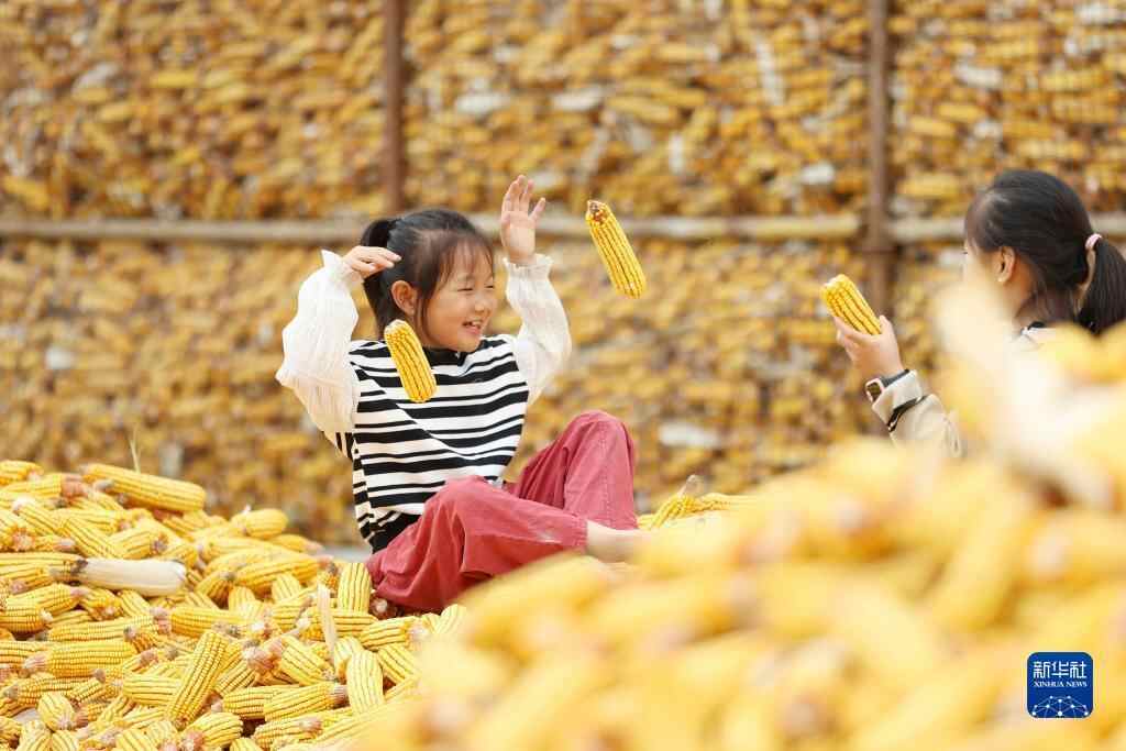 10月3日,在山东省临沂市郯城县郯城街道宋屯村,两名小女孩在玉米堆上玩耍。新华社发(张春雷 摄)