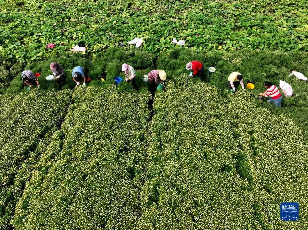 10月4日,在江苏省盐城市大丰区三龙镇东红村,村民采摘菊花(无人机照片)。新华社发(王春摄)