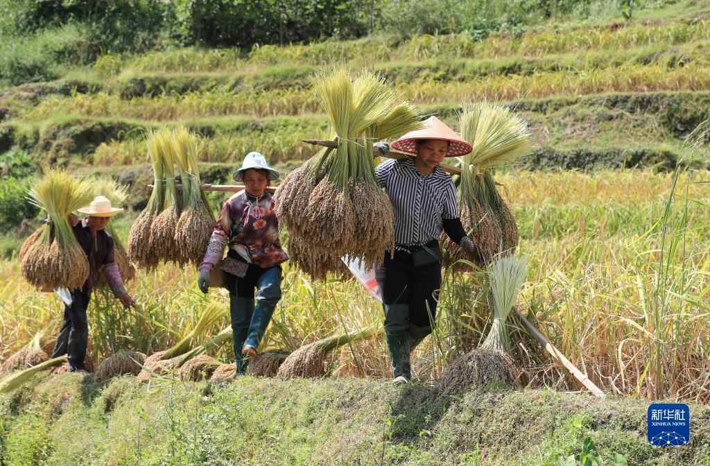 10月4日,村民在贵州省黔东南苗族侗族自治州从江县刚边壮族乡刚边村挑运糯稻。新华社发(罗京来 摄)