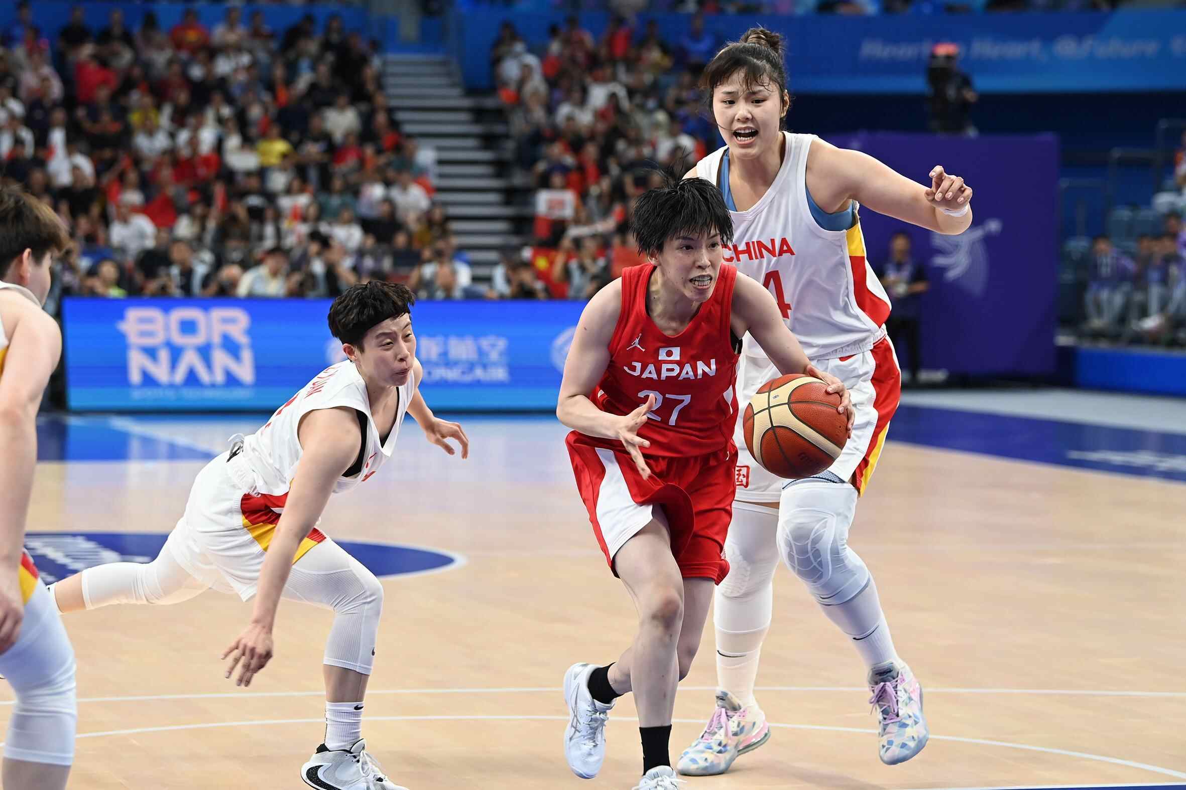 第二节,中国女篮郑薇改用提速与对手周旋,李月汝内线连下5分后,日本队将防守重心向中国的“双塔”倾斜,李梦、李缘频繁突破上篮得分。然而,速度并非中国女篮的优势,以彼之道还之彼身,两队在快速的攻防转换中,中国女篮逐渐失去的节奏,以快制快成为败笔。而日本队则充分发挥小快灵的特点,不断通过灵活多变的挡拆战术获得投射和突破机会,此节三分球6中3,半场将比分追近至40比45。