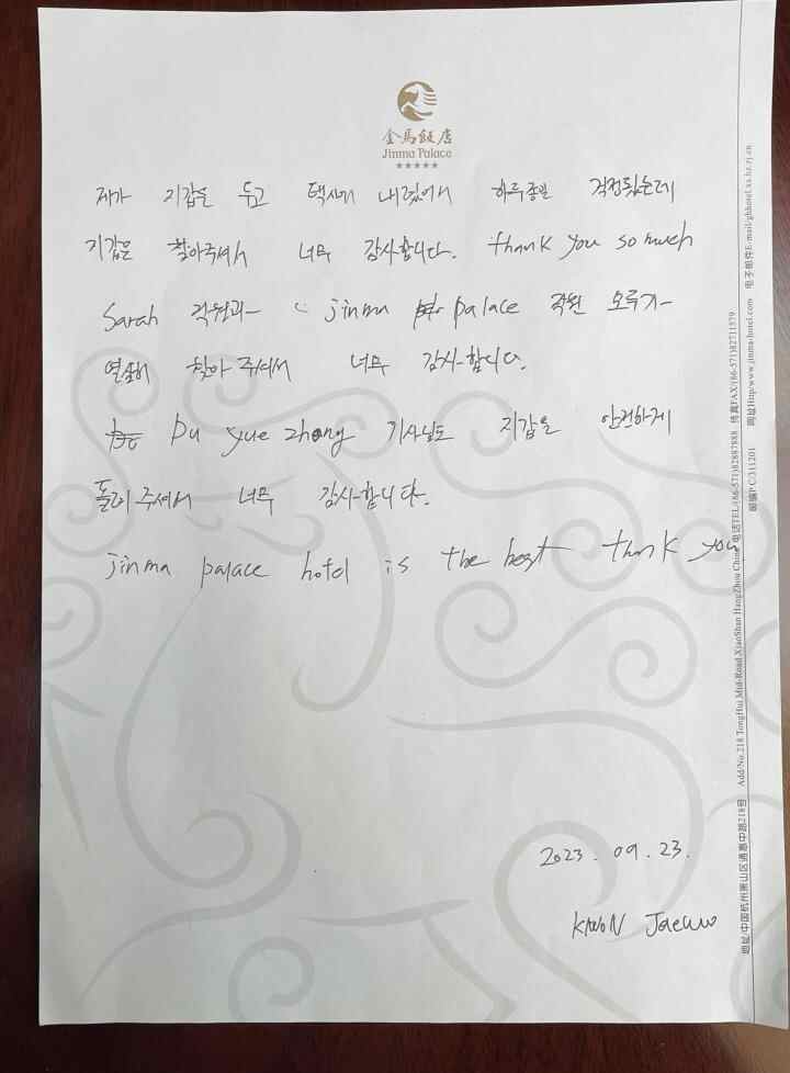 权哉佑也帮忙翻译了另一封韩语感谢信。那位韩国朋友是第一次入住中国酒店,感觉酒店的设施很好、早餐美味、服务贴心,工作人员邓秋凤(Sarah)也很亲切,他也想到处走走看看,享受在中国的美好时光。