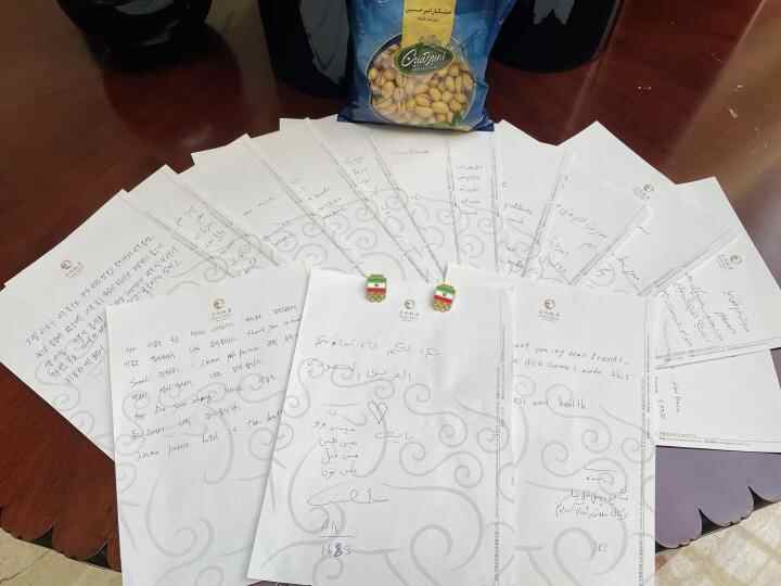 Alireza在这边留下了很多礼物:给邓秋凤的一封感谢信、一枚伊朗徽章、一袋开心果……
