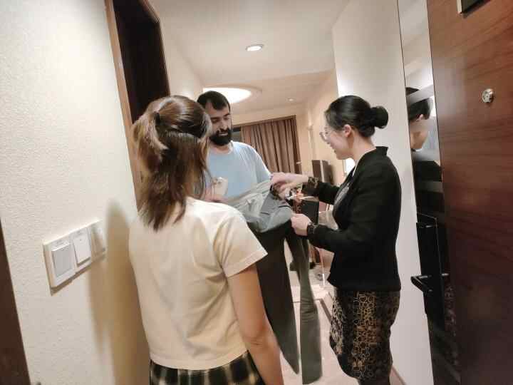 有伊朗客人的裤子纽扣掉了,却着急第二天要穿,他们主动帮忙缝扣子,5分钟后就将裤子归还客人。伊朗朋友如释重负,赶紧拿出家乡特产无花果干,邀请大家品尝。