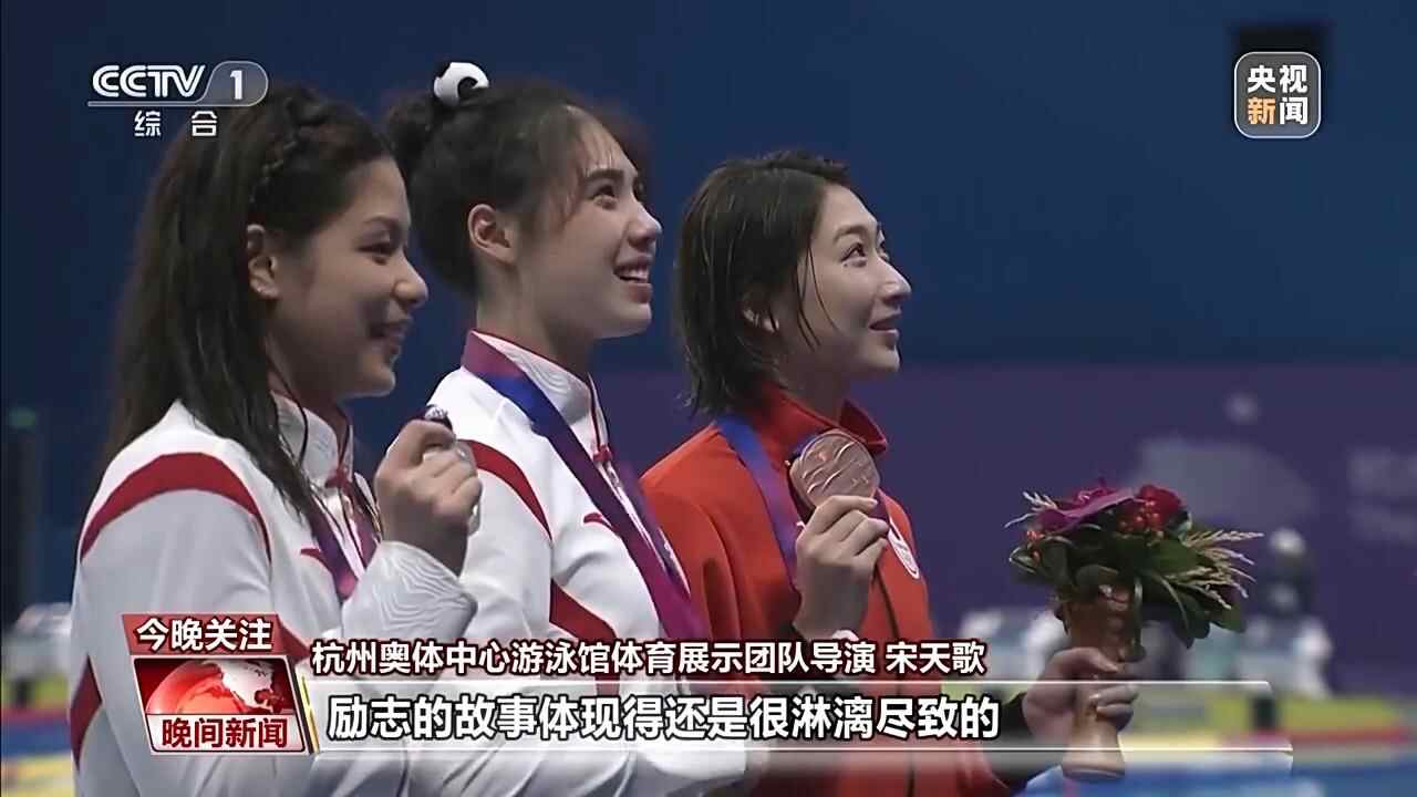杭州奥体中心游泳馆体育展示团队导演 宋天歌:这次亚运会最感人的一个故事之一,就是池江璃花子和张雨霏的故事。张雨霏和池江璃花子在福冈世锦赛的时候,他们相约约定杭州亚运会见,然后我们预制了一个30秒的片子,当时现场片子出来,观众会“哇”的一声,把她们俩的友谊,包括这种故事,励志的故事体现得还是很淋漓尽致的。
