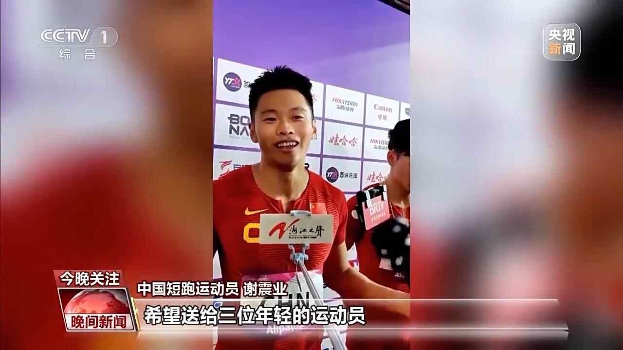 中国短跑运动员 谢震业:是我特意找组委会说,万一我们拿金牌的话,希望送给三位年轻的运动员,在年轻的战场上,所有人为他们骄傲鼓掌。
