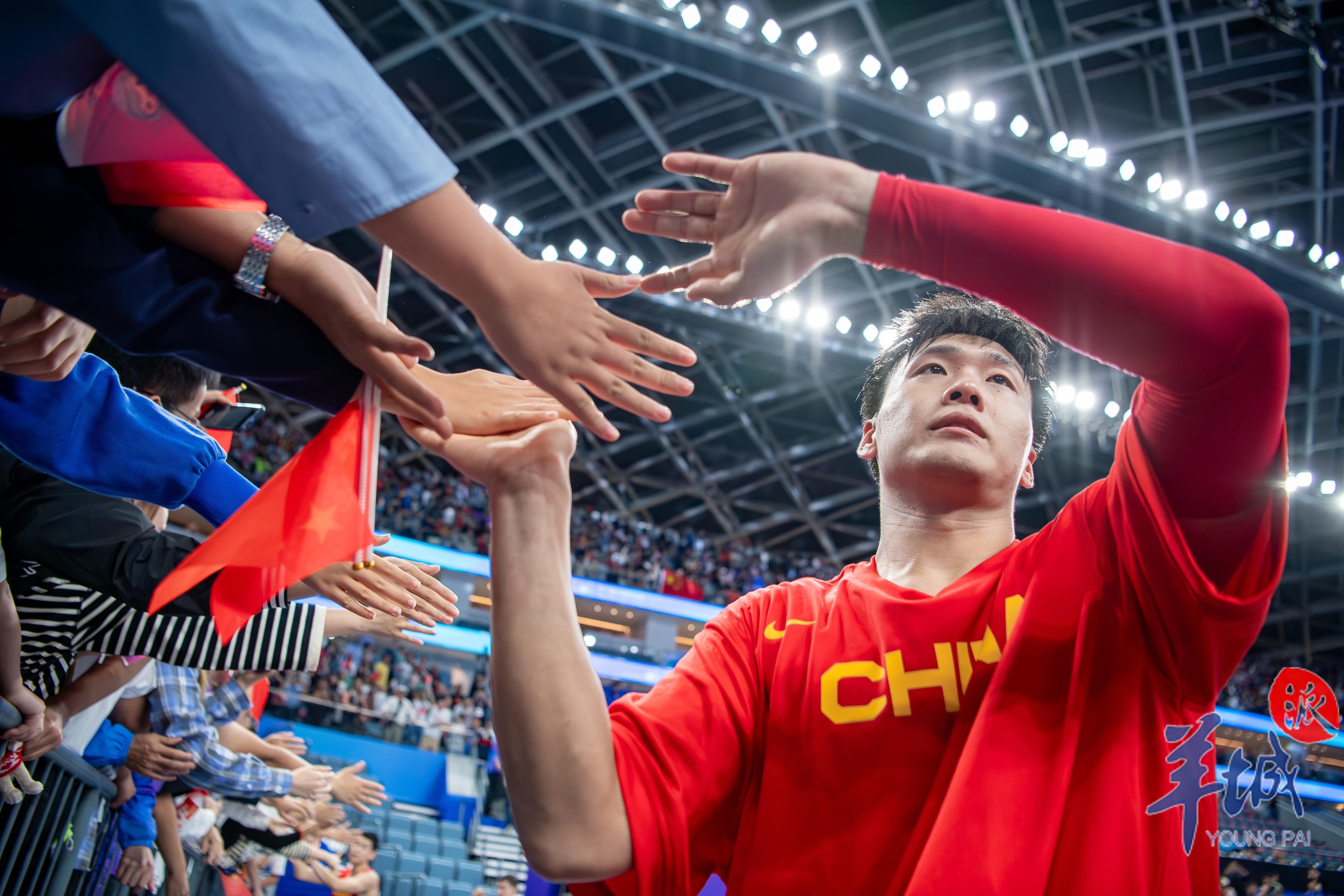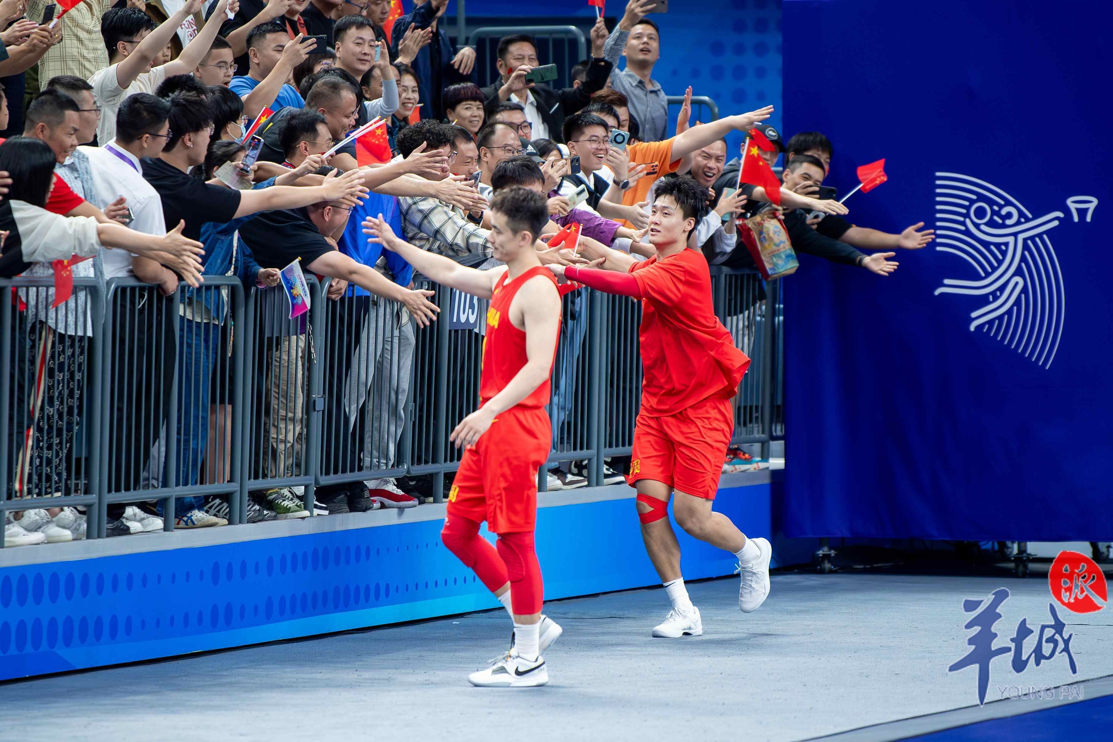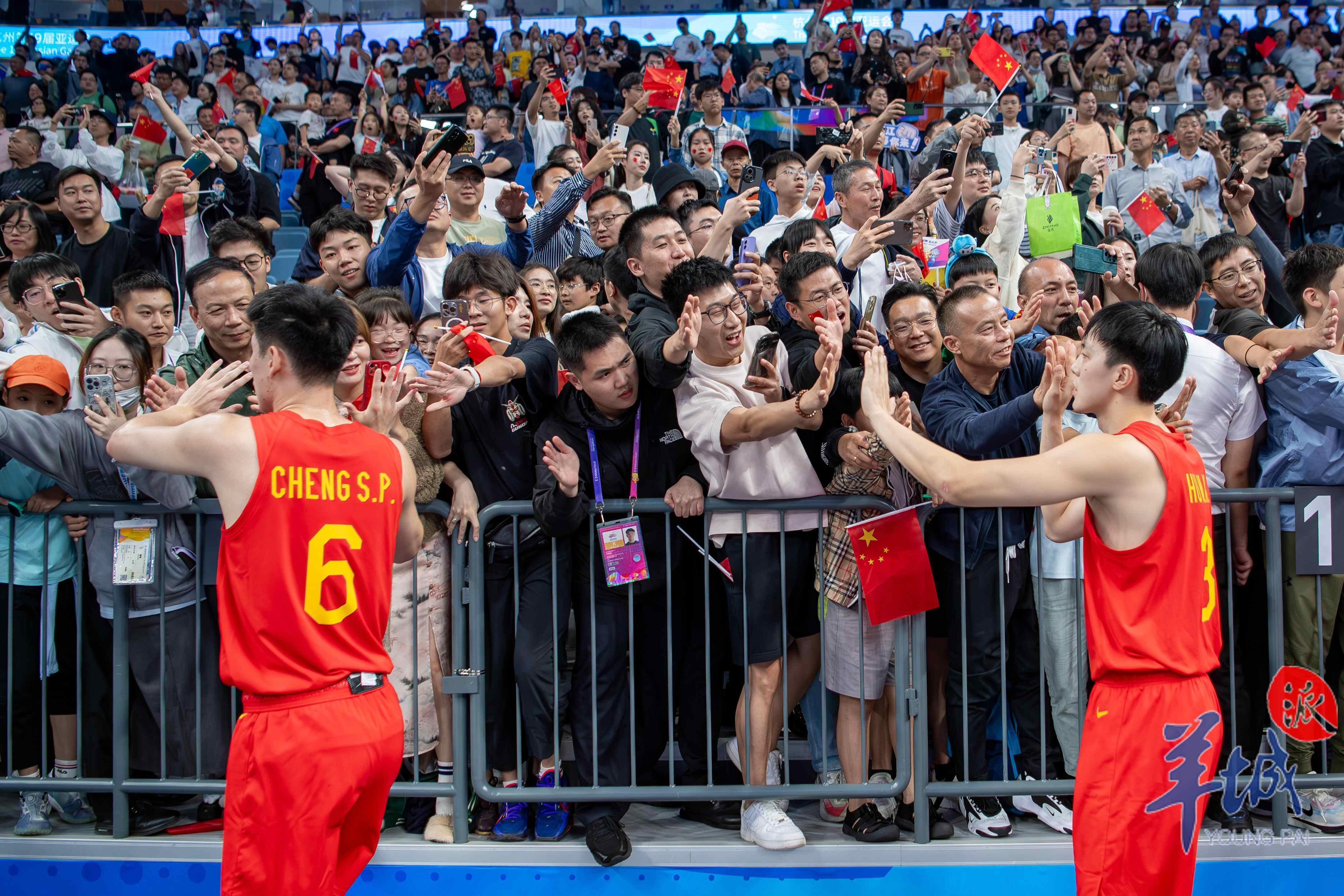 中国男篮赢得比赛后,队员们绕场与球迷们击掌握手