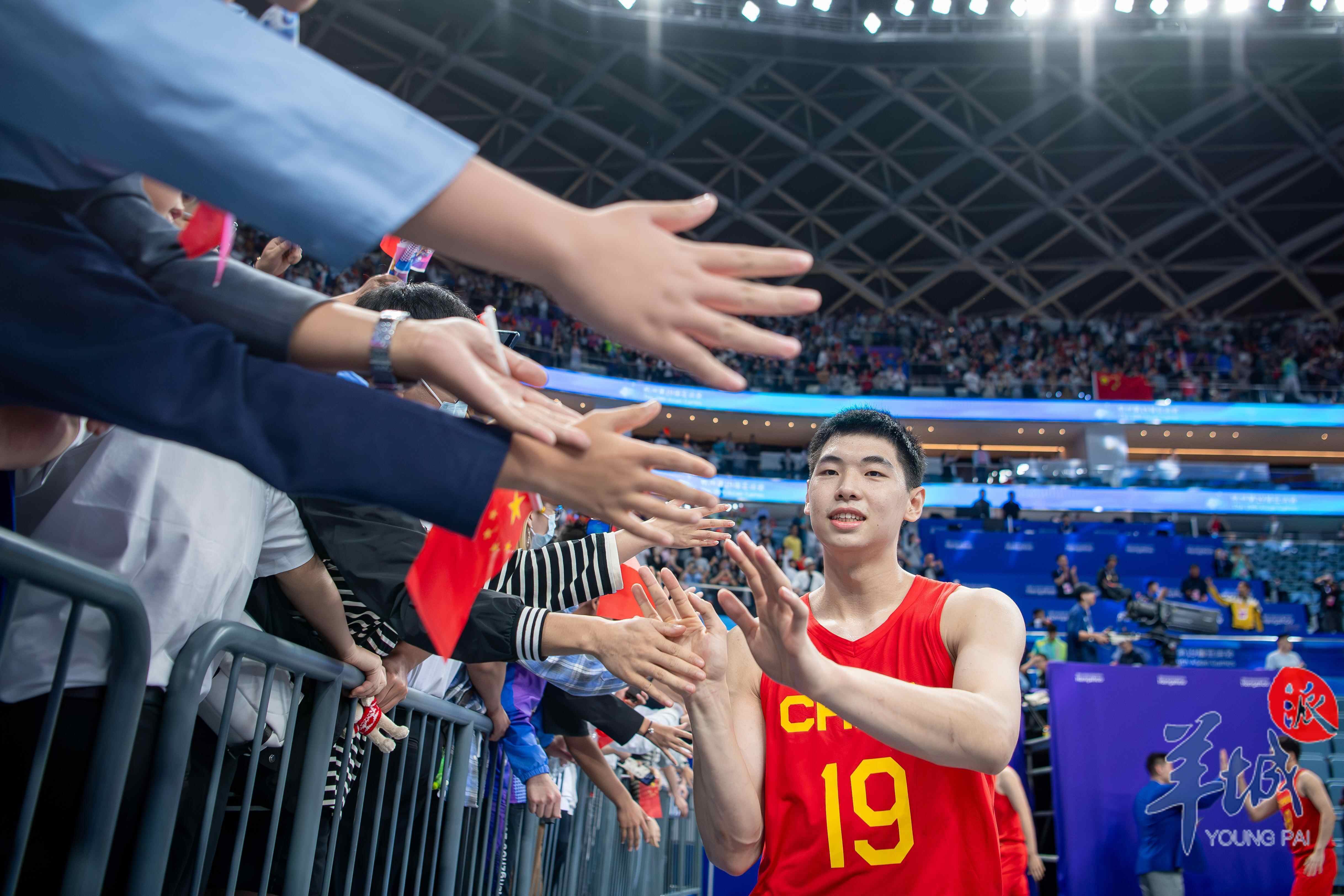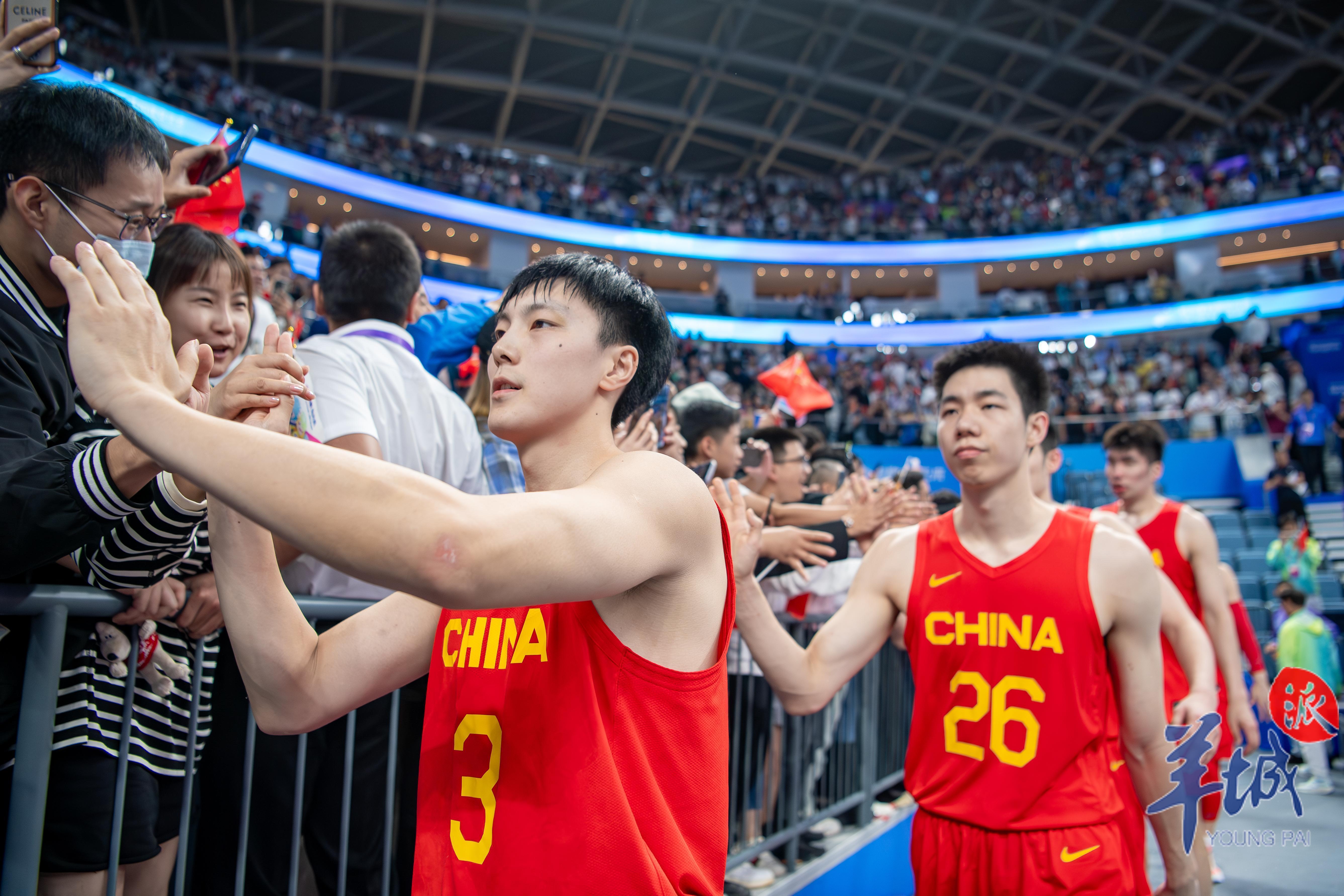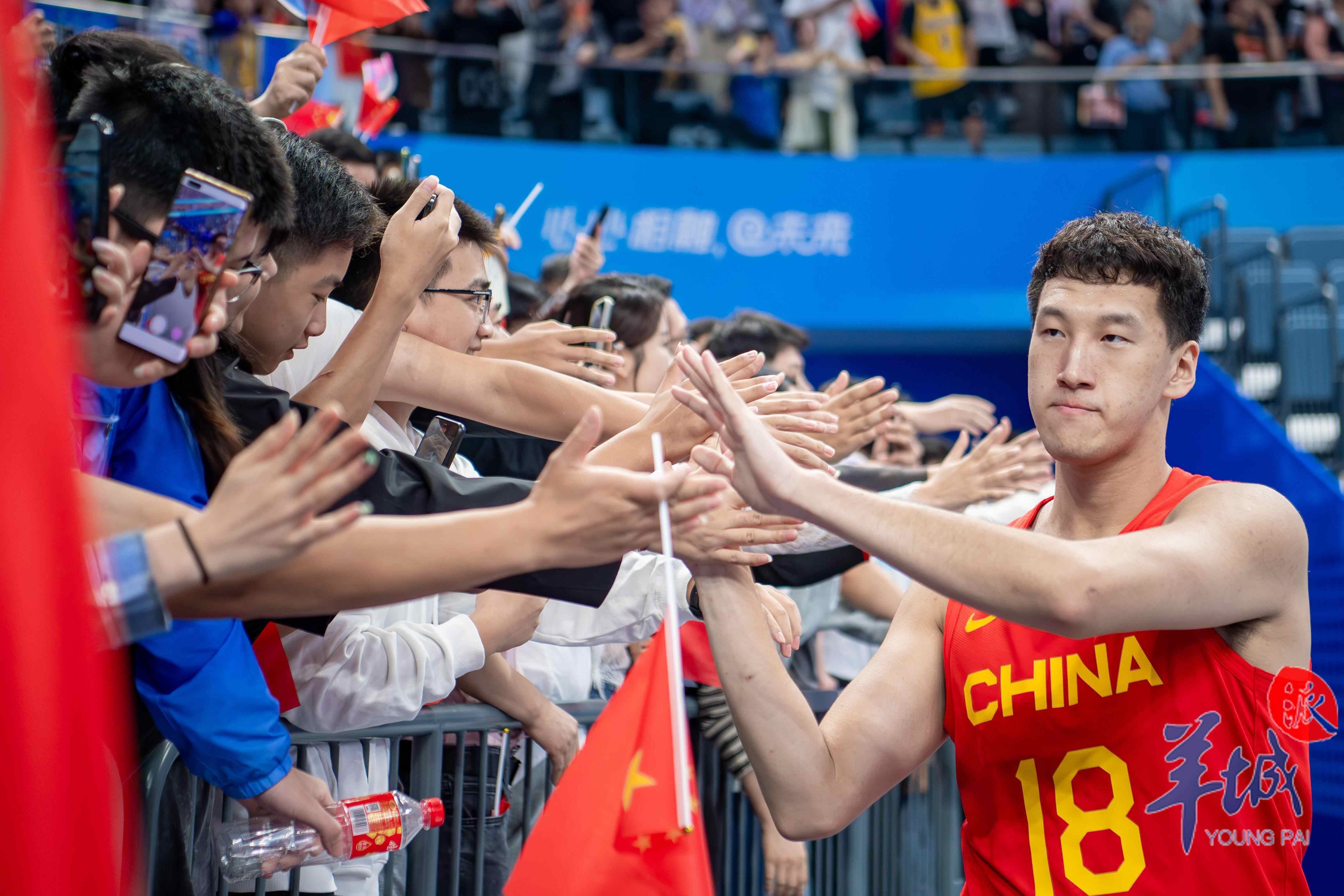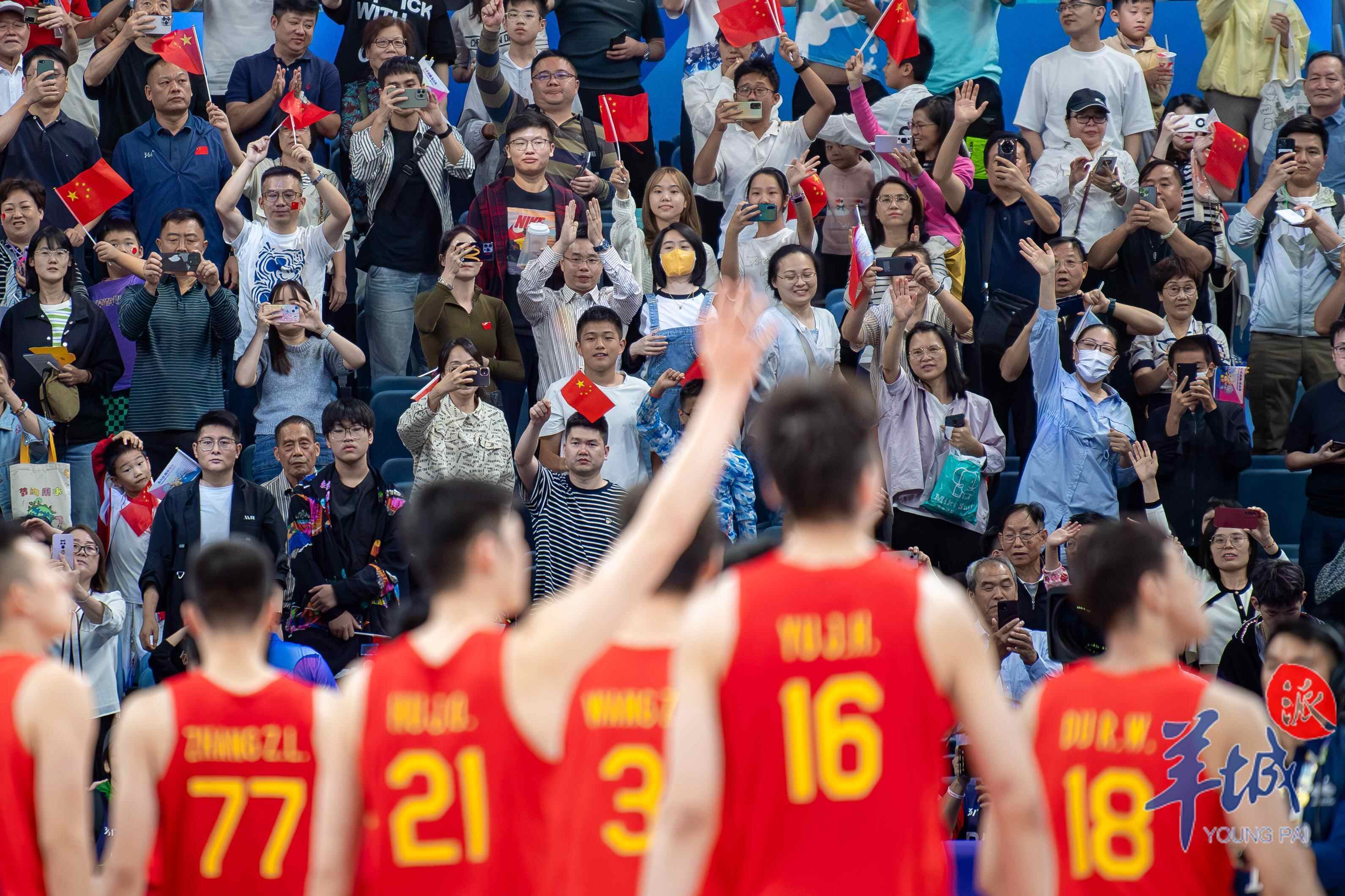 中国男篮赢得比赛后,队员们绕场与球迷们击掌握手